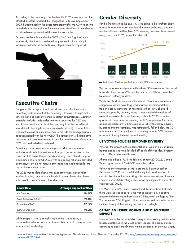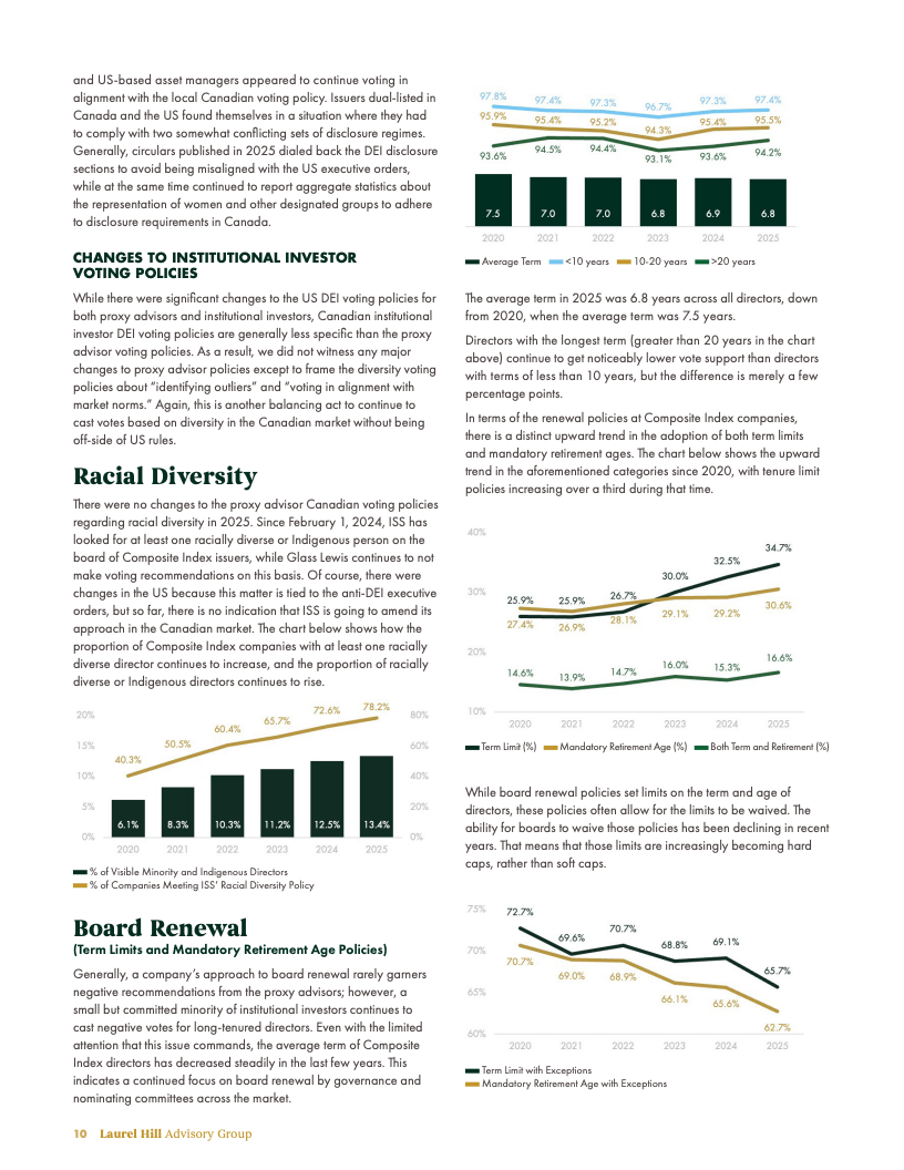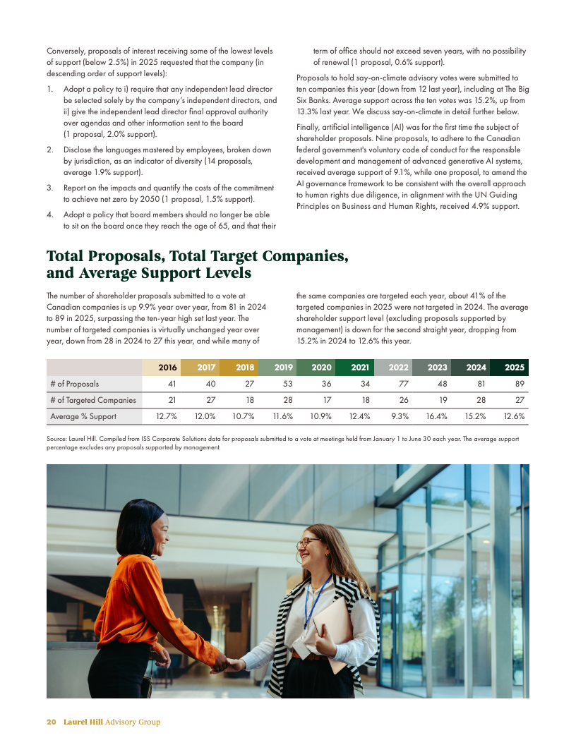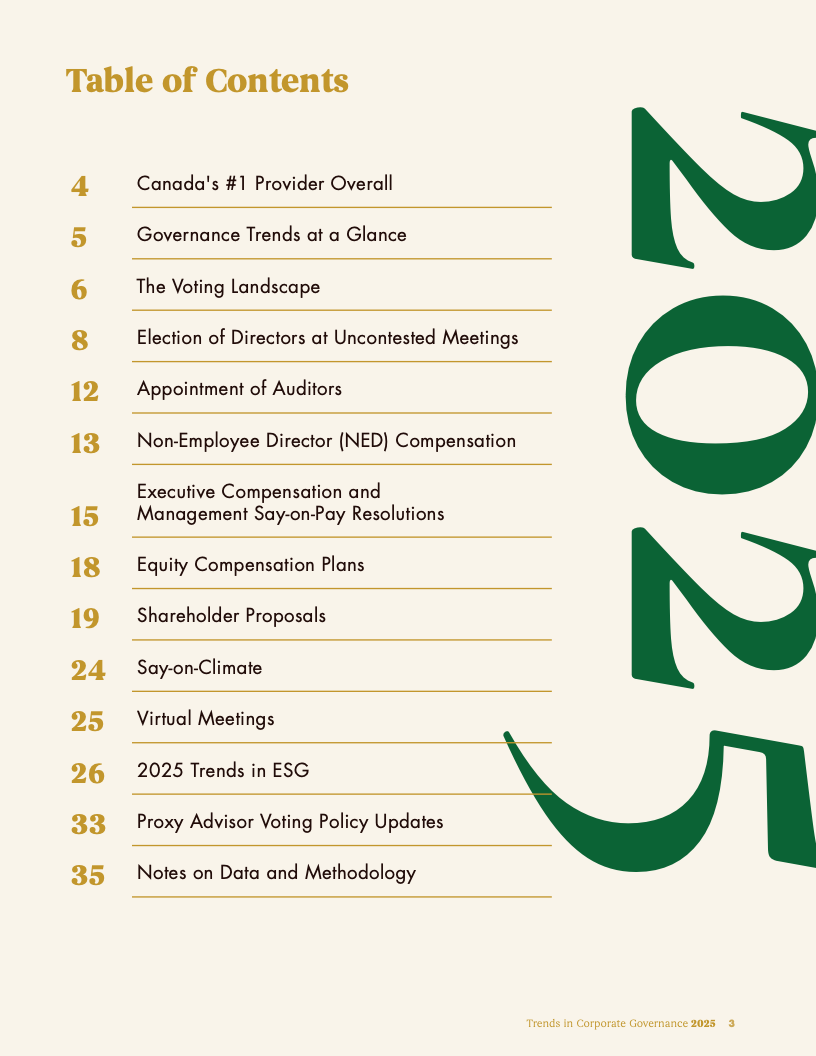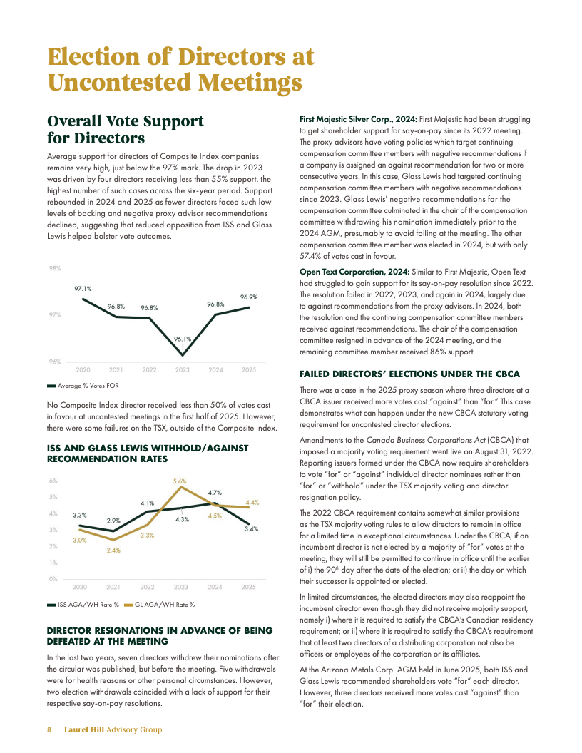 2025年加拿大企业治理持续深化,S&P/TSX公司投票参与率接近70%。其中,5%的公司参与率低于40%,为决议失败和激进投资者行动的高风险群体。代理顾问影响力在50%参与率下,Glass Lewis反对票占实际投票数40%,可致决议陷入危险。2025年“代理投票传递”机制影响有限,Vanguard仅0.1%参与,资产63.4%选择默认政策,显示激进政策需求不足。