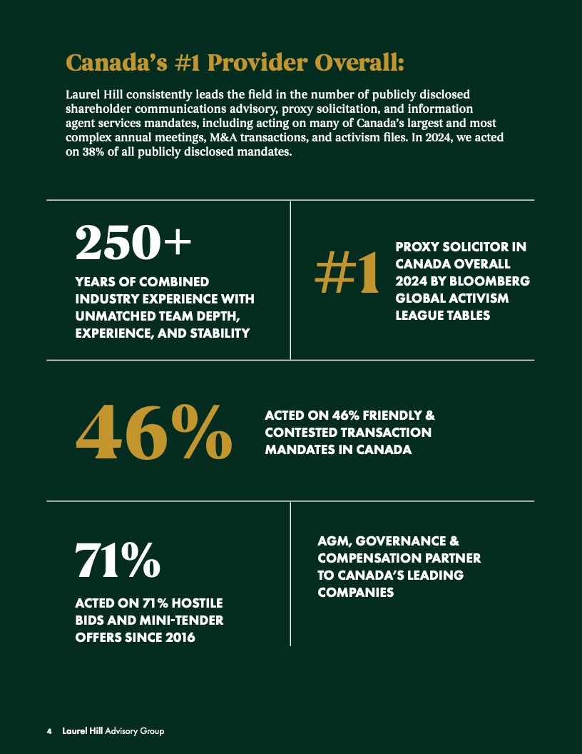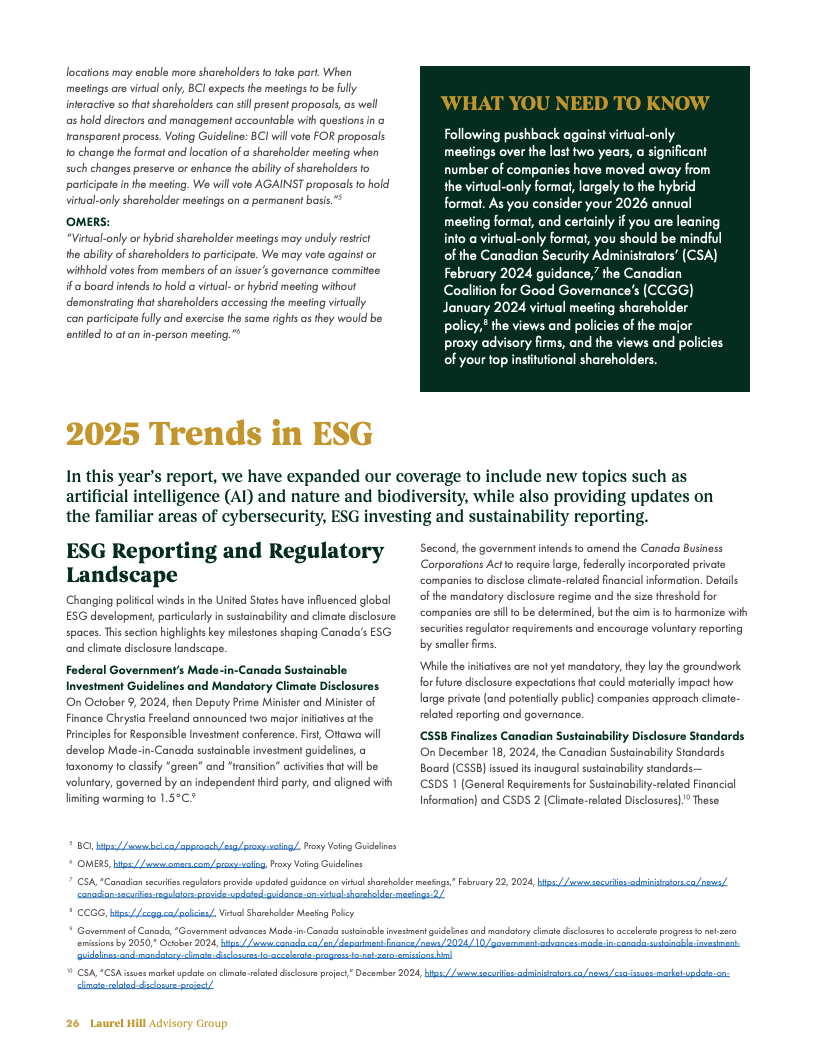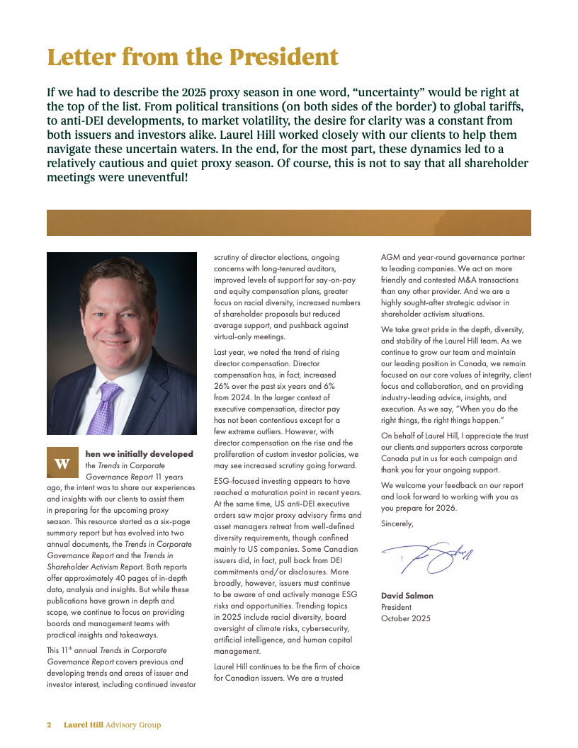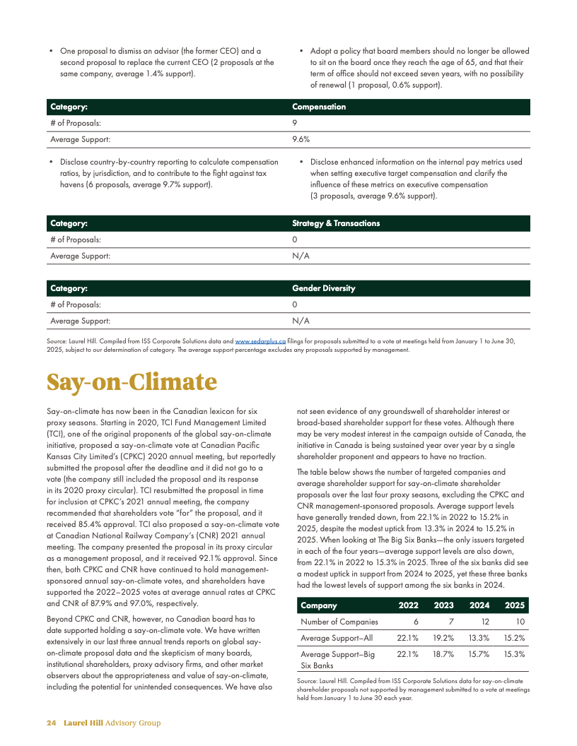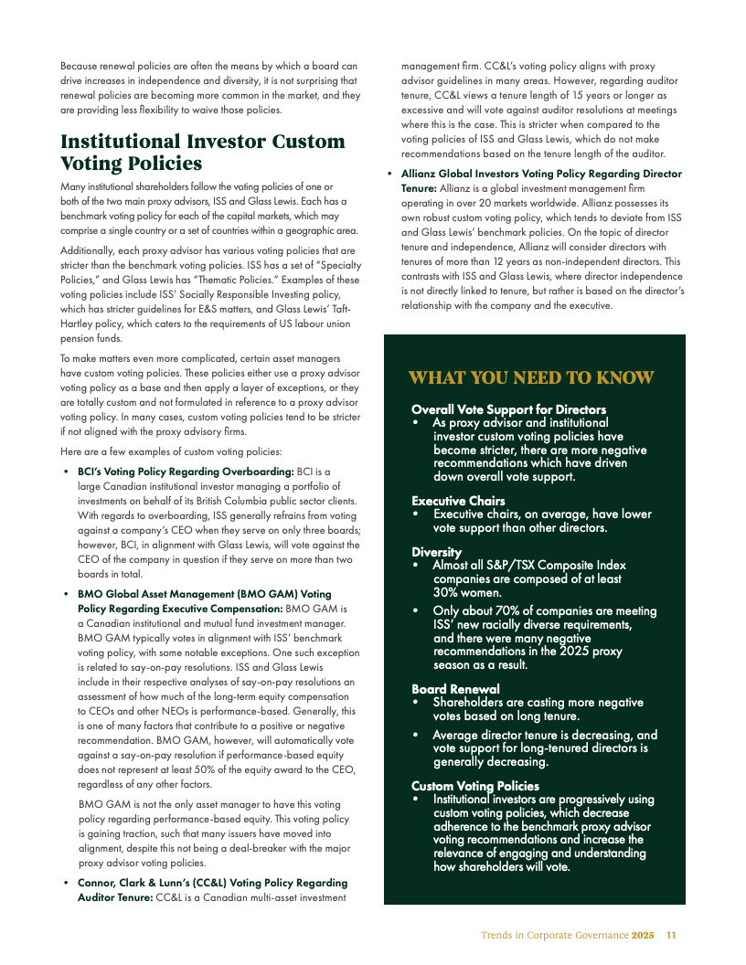 2025年加拿大企业治理持续深化,S&P/TSX公司投票参与率接近70%。其中,5%的公司参与率低于40%,为决议失败和激进投资者行动的高风险群体。代理顾问影响力在50%参与率下,Glass Lewis反对票占实际投票数40%,可致决议陷入危险。2025年“代理投票传递”机制影响有限,Vanguard仅0.1%参与,资产63.4%选择默认政策,显示激进政策需求不足。