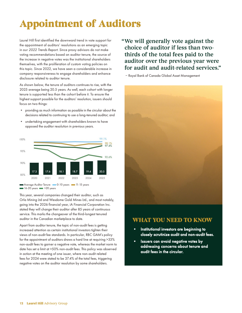 审计师平均任期升至20.5年,机构投资者关注度提升。iA Financial结束85年审计师任期创记录。非审计费用成新焦点,RBC GAM将33%设为红线,2025年有发行人因37.4%被反对。ISS及Glass Lewis对审计委任反对率低于六年均值,说明公司主动解释和沟通措施有效。