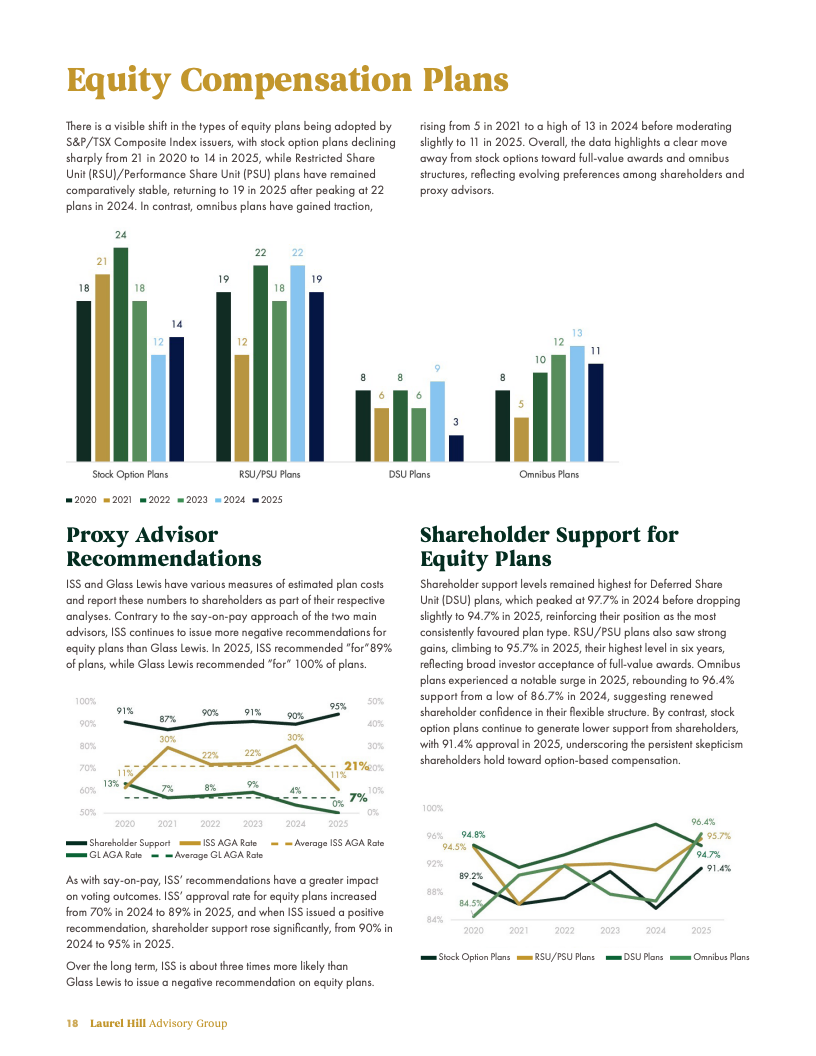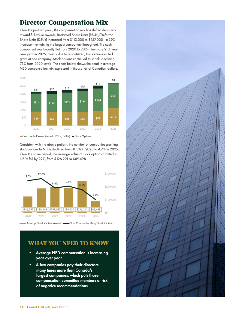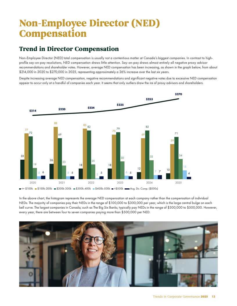 2025年非雇员董事平均总薪酬达27万加元,六年涨幅达26%,薪酬结构向全额股份单位倾斜,股票期权公司占比由2020年11.3%降至4.7%,平均授予价值下跌29%。极端值才引发负面建议,主流公司薪酬仍被市场认可。
