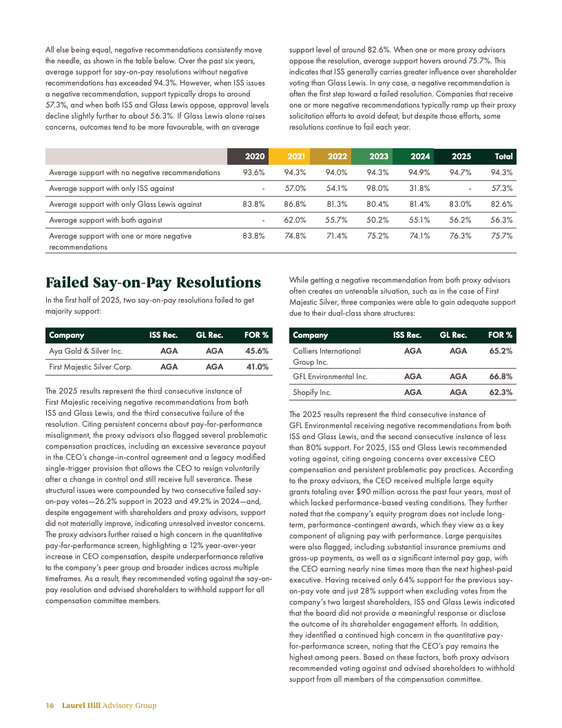 高管薪酬表决权平均支持率达92.9%,创历史新高。ISS反对率降至2.5%,Glass Lewis降至9.9%。双反对公司如First Majestic仅获41%支持,绩效错配、过度离职金被密切关注。13家公司支持率在50-80%区间,下年度须披露改进细节。