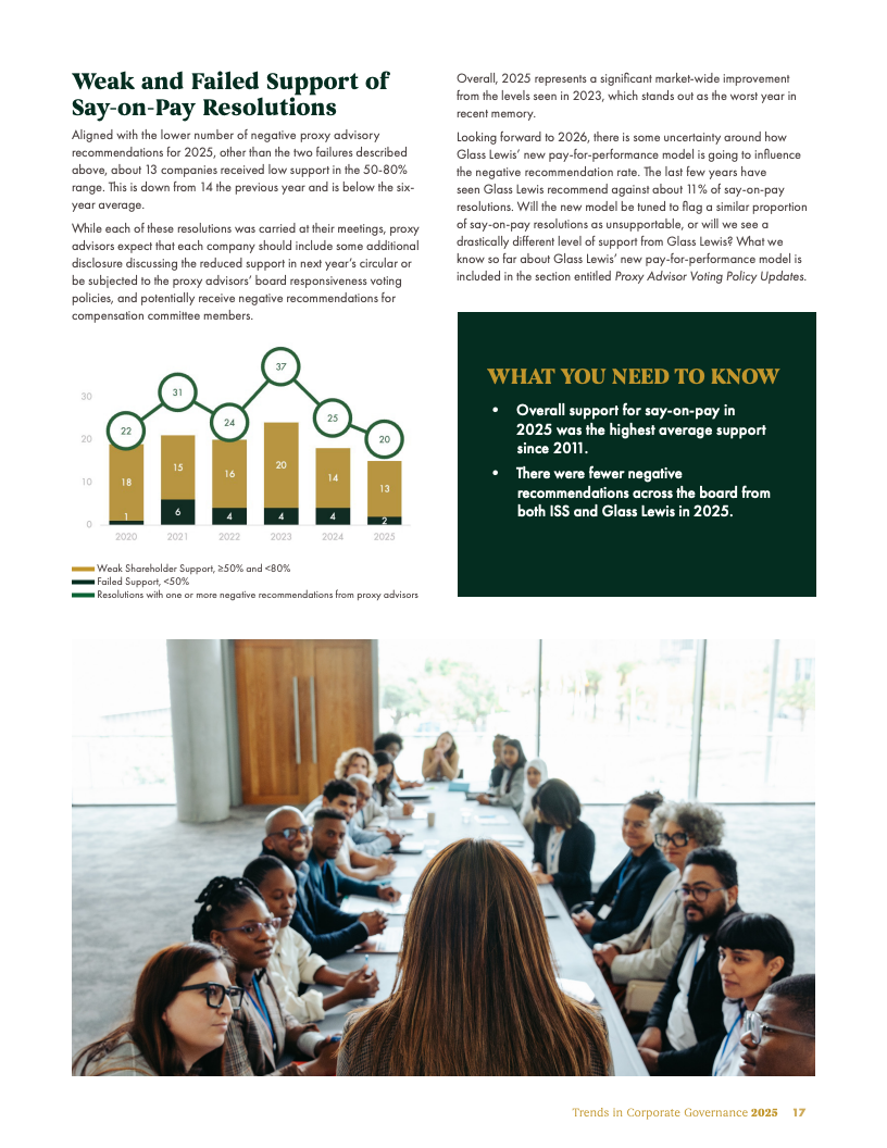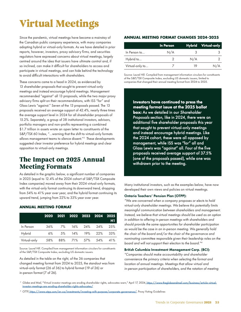 会议形式加速转向混合与现场,2025年41%公司采用纯虚拟会议,较2024年降低,混合模式增至33%。主要投资机构制定政策反对纯虚拟会议,强化虚拟参与者权利保障。