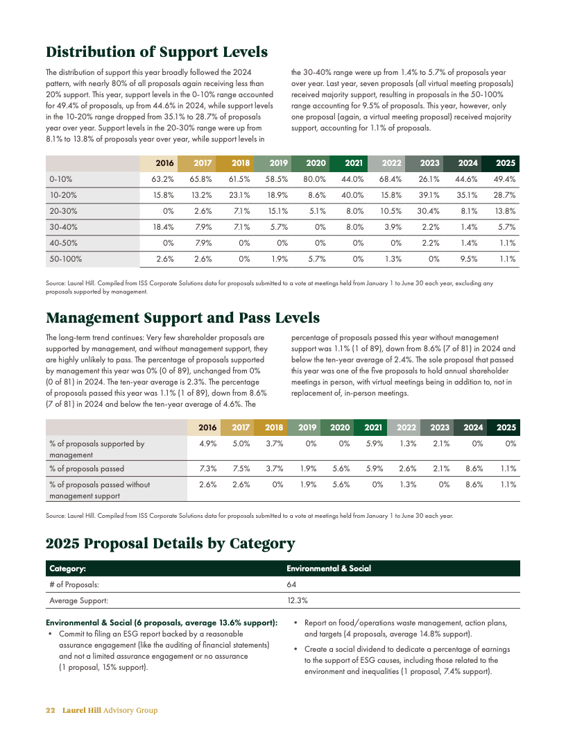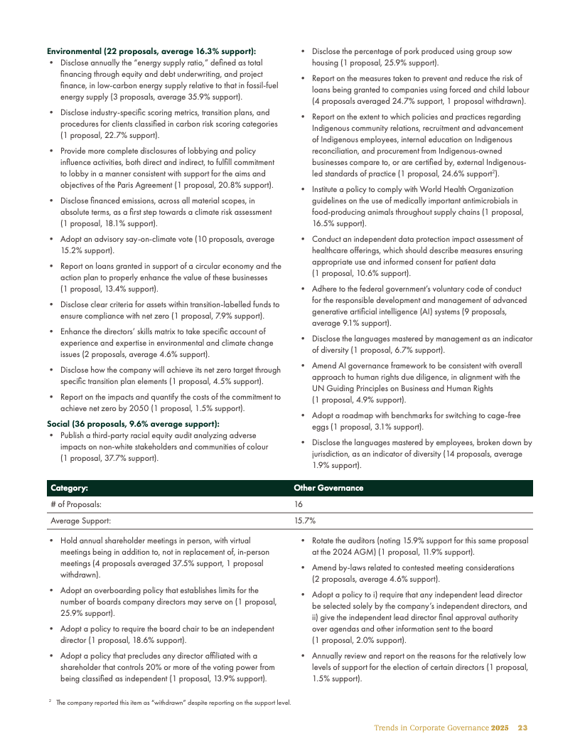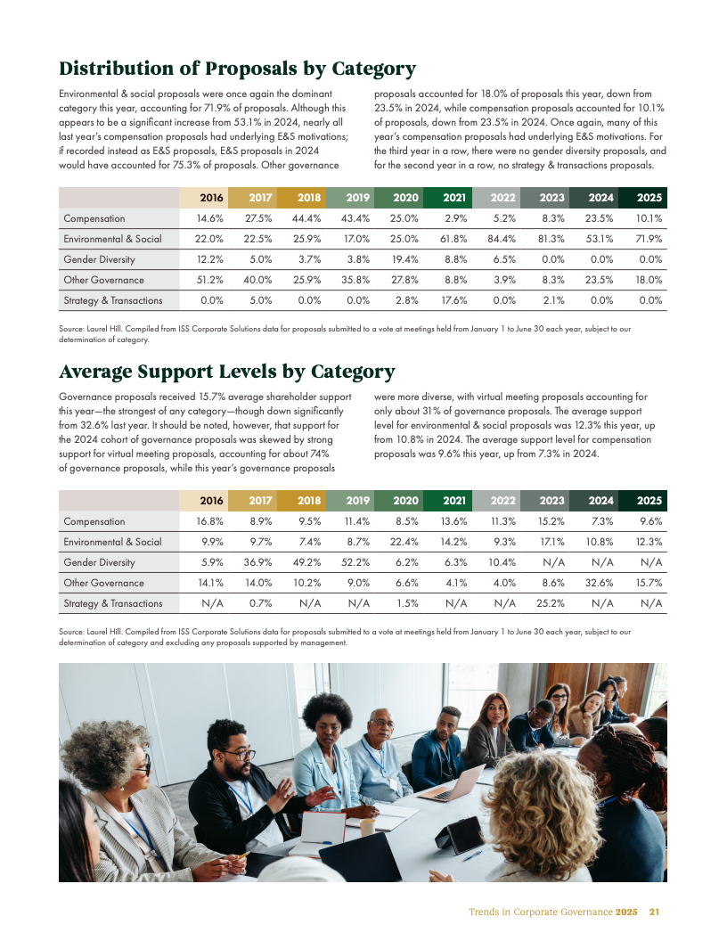 股东提案数增至89项,涉及27家公司,环境与社会提案占71.9%。平均支持率低于13%,仅一项获管理层支持。AI相关提案首现,仅9.1%支持,人权框架AI治理提案支持率为4.9%。