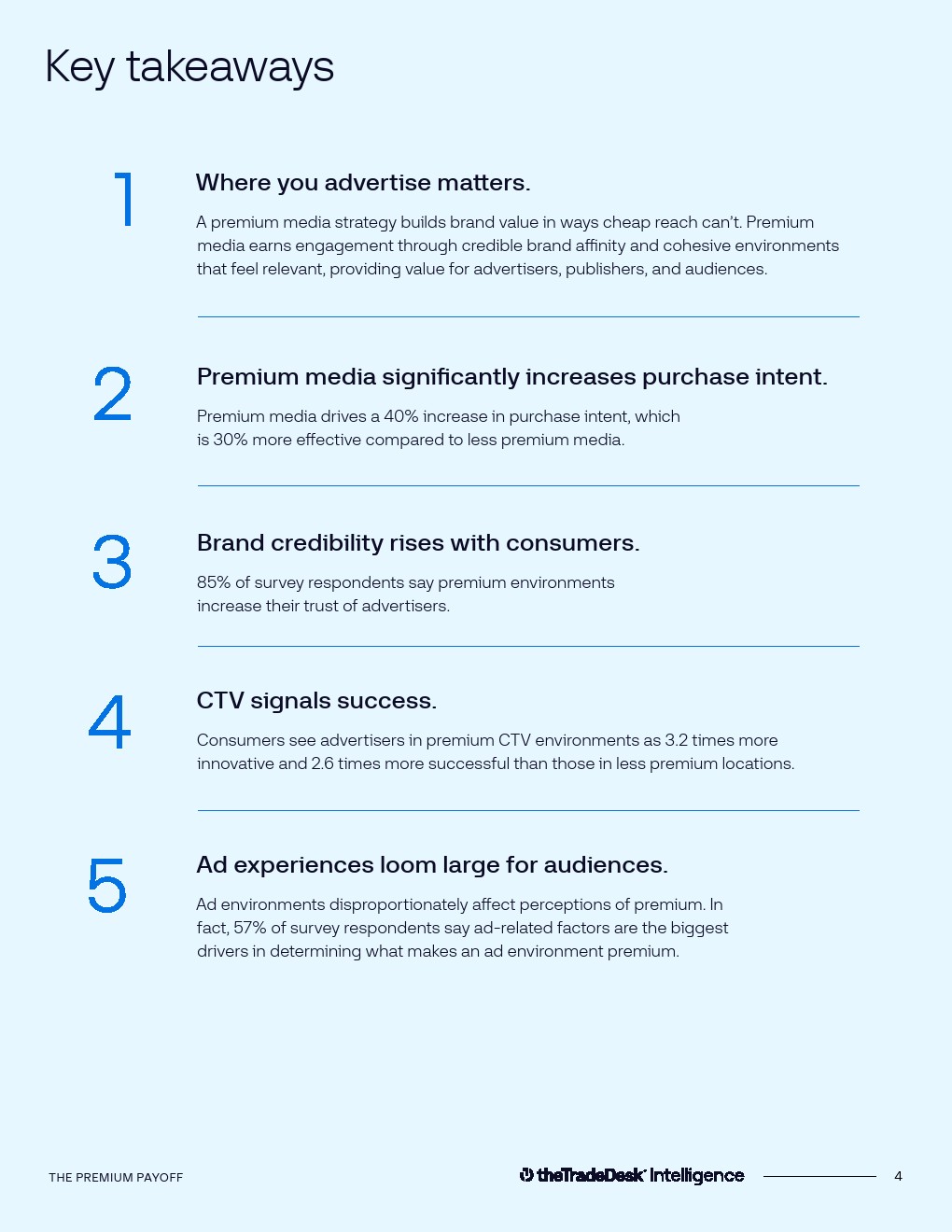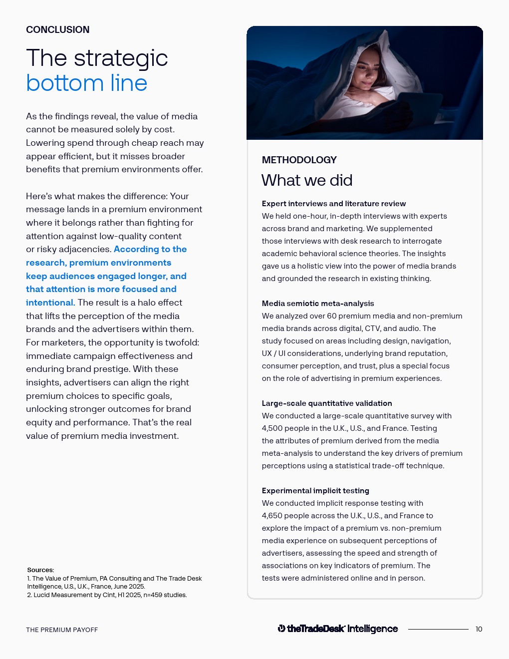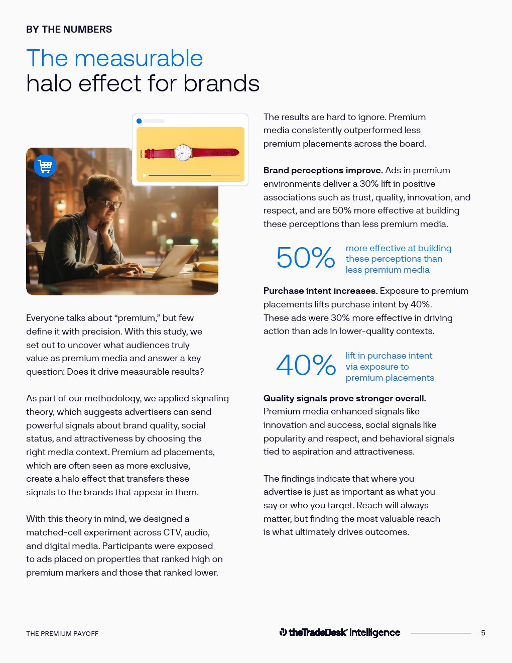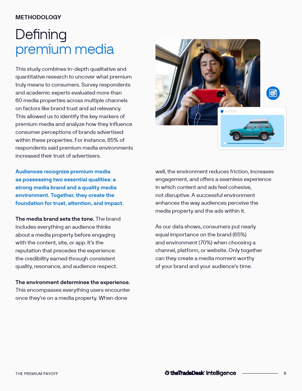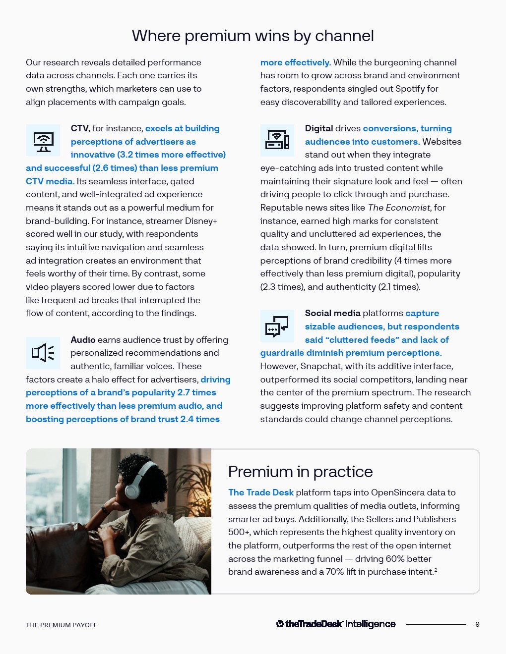 数据实验进一步验证了优质媒体的“光环效应”。在对CTV、音频与数字媒体进行匹配实验后发现,优质媒体环境可使品牌正向认知提升30%,包括信任度、质量感与创新度等指标。同时,优质媒体带来的购买意愿提升达到40%,在推动消费行动方面比低质量媒体高出30%。这表明媒体环境不仅影响品牌形象,还直接作用于商业转化效率。
