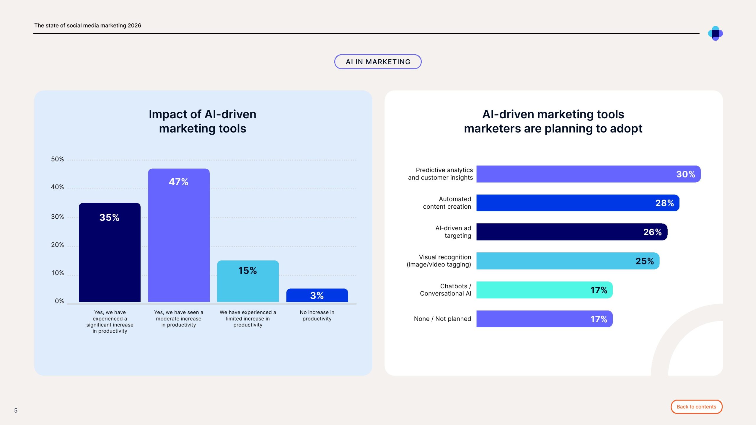 人工智能正在营销人员最需要的地方——时间——证明其价值。高达82%的营销人员表示人工智能工具提高了生产力,但对大多数人来说,这种提升是渐进的。仅有35%的人认为提升显著,而近半数的人(47%)表示提升适中。