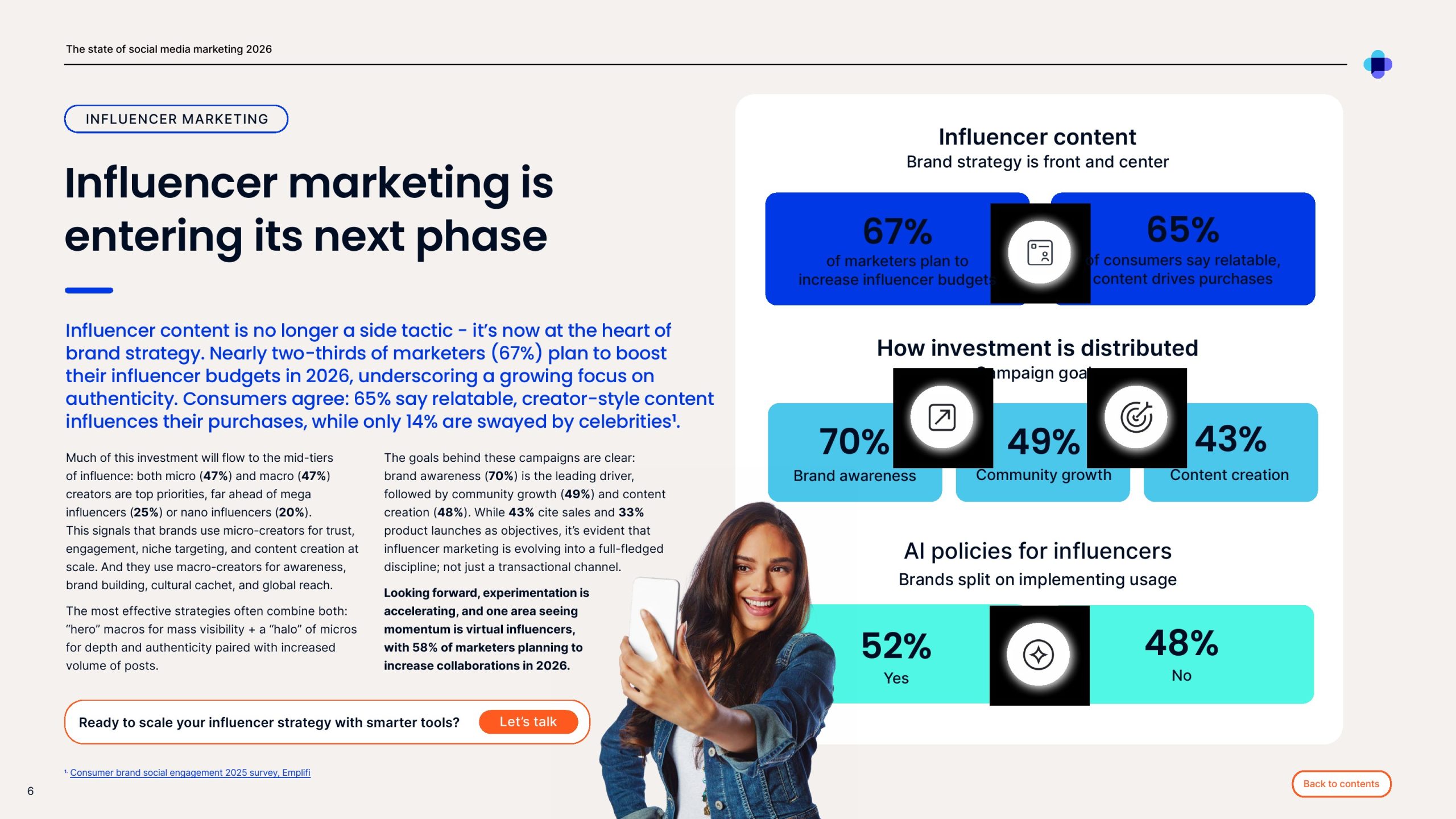 意见领袖内容不再是一种次要策略——它现在已成为品牌战略的核心。67%的营销人员计划在2026年增加意见领袖预算,突显出对真实性的日益关注。消费者也认同这一点:65%的人表示,贴近生活的创作者风格内容会影响他们的购买决策,而只有14%的人会受到名人的影响。