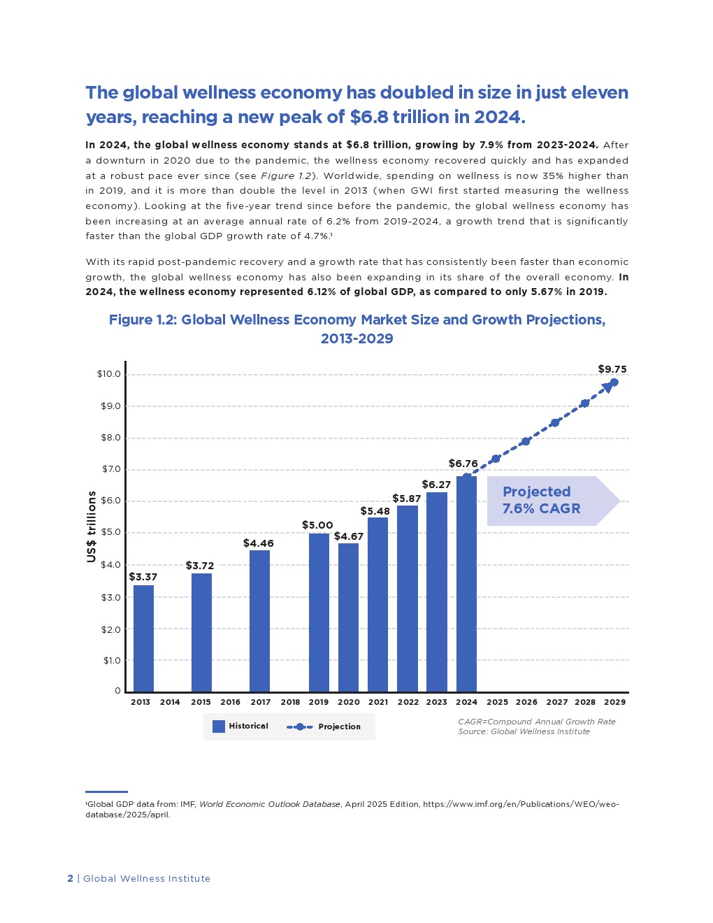 全球康养经济在2024年达到6.76万亿美元,占全球GDP比重提升至6.12%,较2019年的5.67%明显抬升。2019至2024年期间,全球康养经济复合年增长率为6.2%,显著高于同期全球经济增速。报告预计,到2029年全球康养经济规模将接近9.8万亿美元,2024至2029年的预测年均增速提升至7.6%,显示其已从疫情冲击后的修复阶段转入中高速扩张通道。