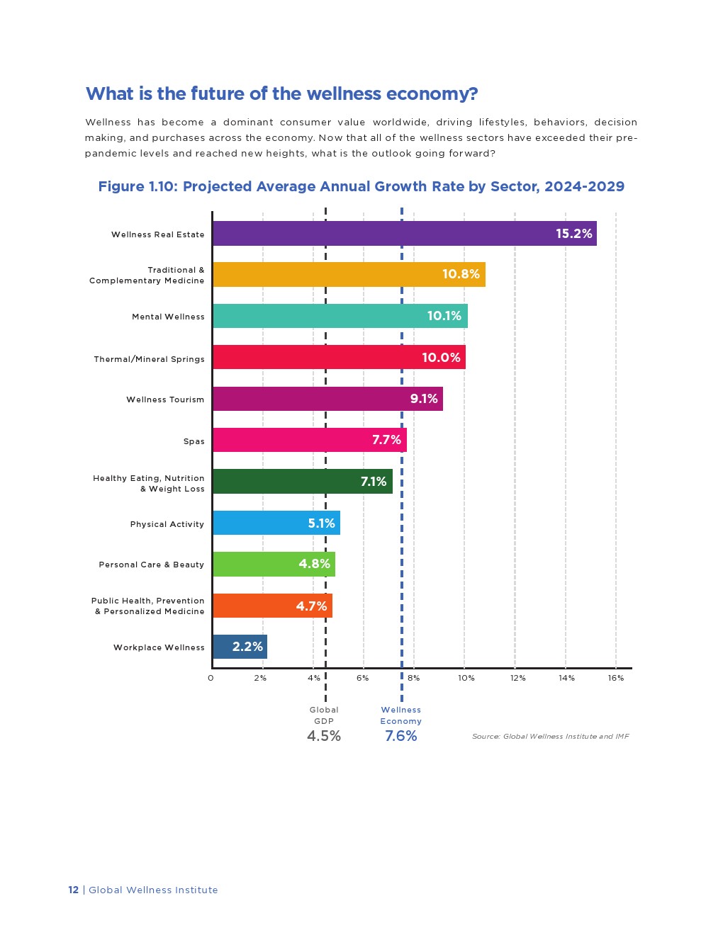 从产业结构看,个人护理与美容、健康饮食与体重管理、体育与身体活动仍构成康养经济的核心支柱,2024年合计规模超过3.6万亿美元,占全球康养经济总量的54%。其中个人护理与美容市场规模达1.35万亿美元,2019至2024年年均增长4.8%,显示消费韧性强、周期波动小,是典型的“防御型成长赛道”。