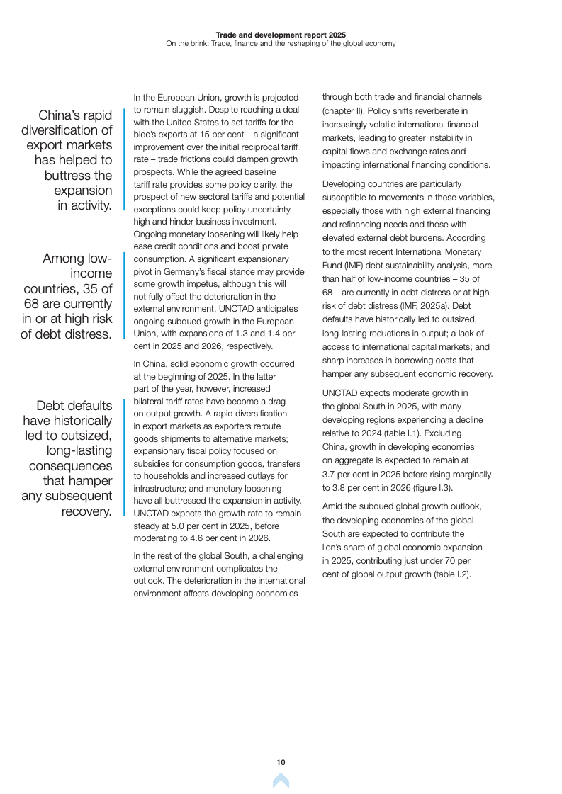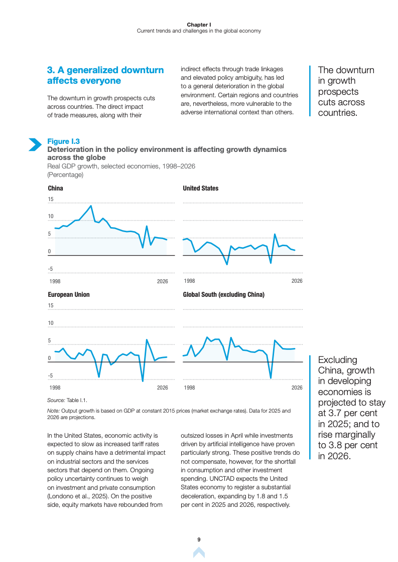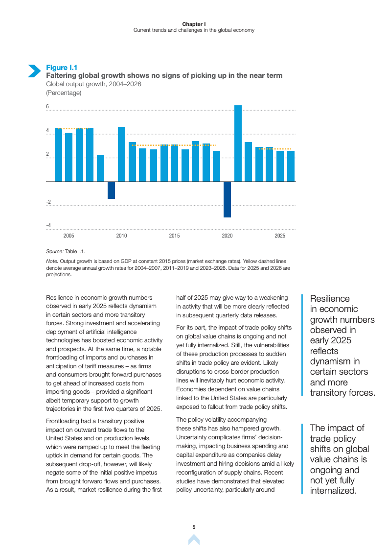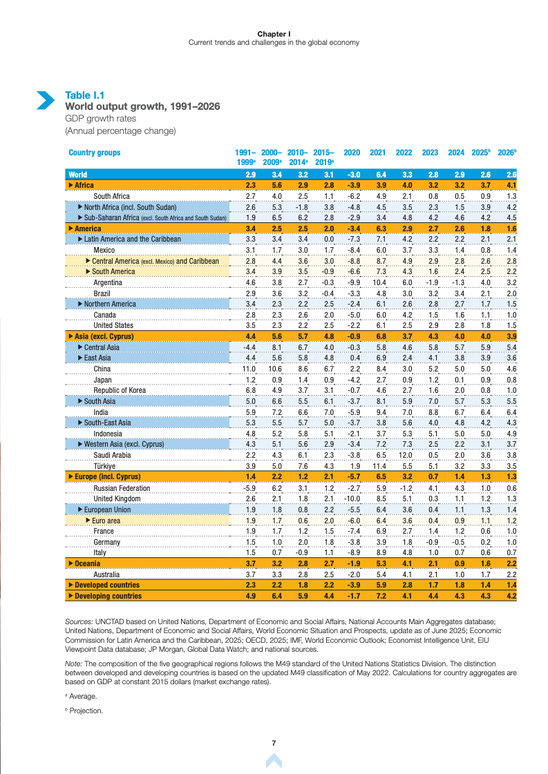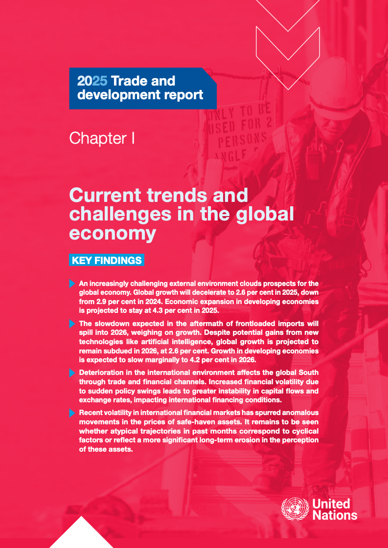 2025年贸易和发展报告揭示了全球经济增长动能的显著衰退,预计2025年全球GDP增速将从2024年的2.9%下滑至2.6%。尽管短期内因关税避险导致贸易额短暂冲高至4%,但受制于紧缩的金融环境,全球贸易的基础增长率预计将长期徘徊在2.5%至3%的低位区间。