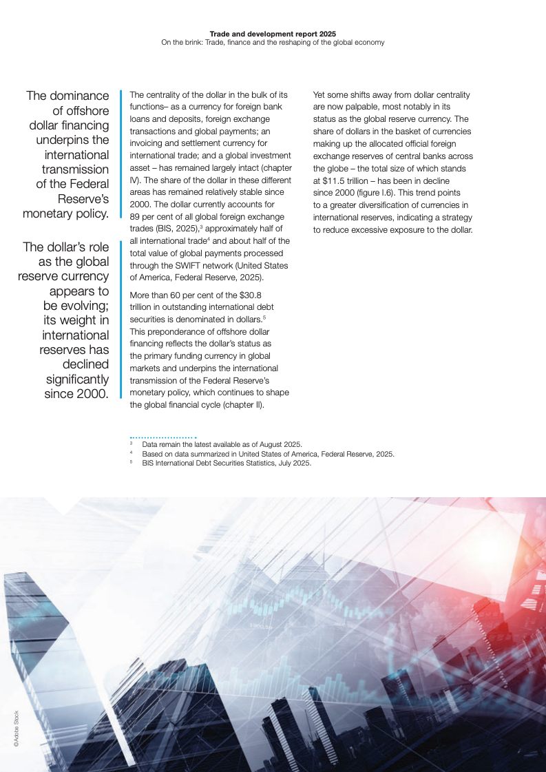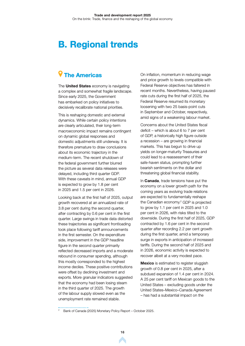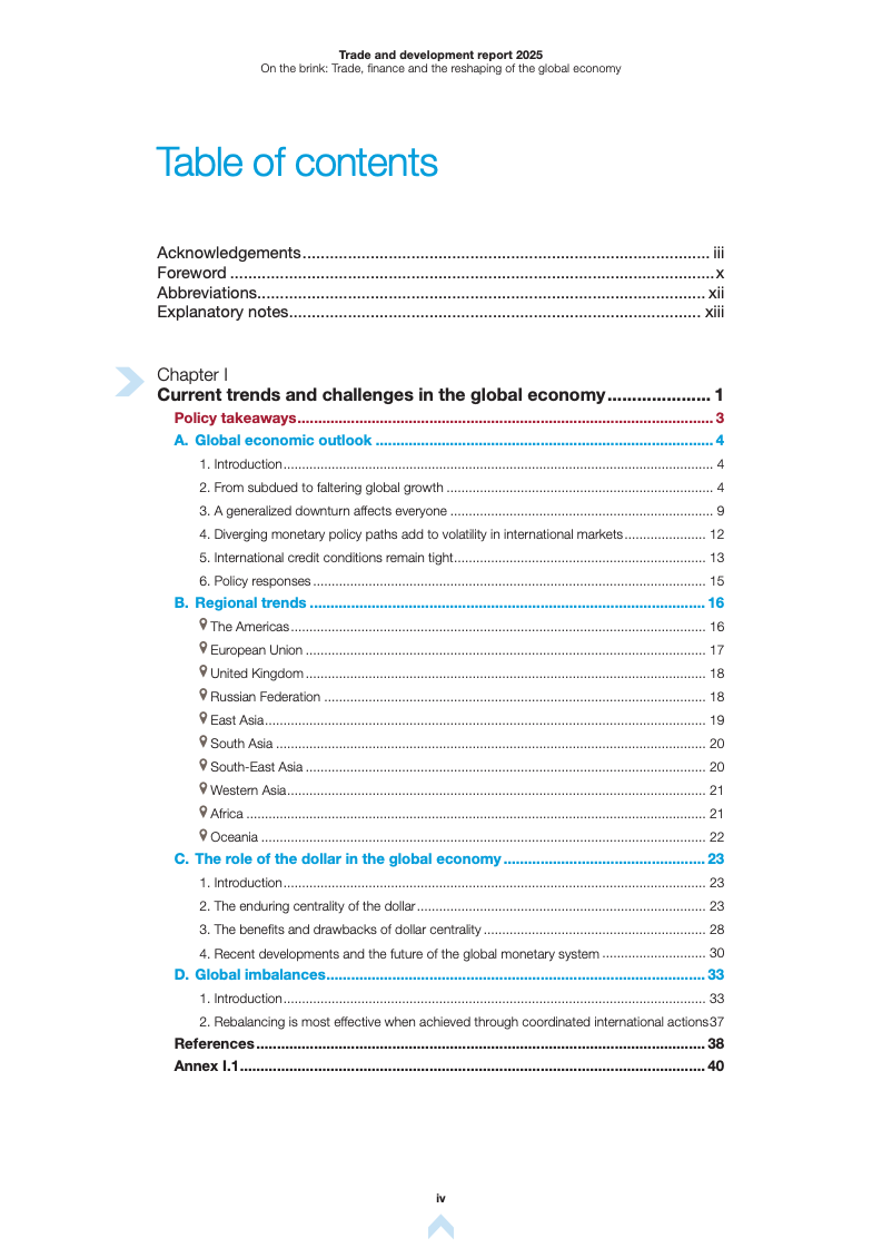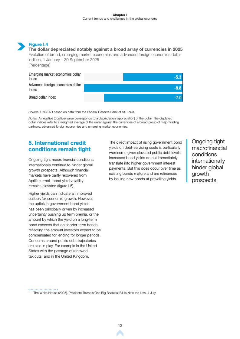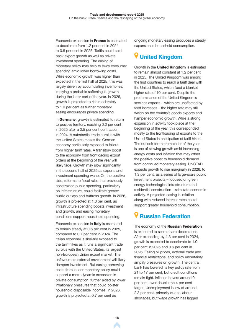 2025年贸易和发展报告揭示了全球经济增长动能的显著衰退,预计2025年全球GDP增速将从2024年的2.9%下滑至2.6%。尽管短期内因关税避险导致贸易额短暂冲高至4%,但受制于紧缩的金融环境,全球贸易的基础增长率预计将长期徘徊在2.5%至3%的低位区间。
