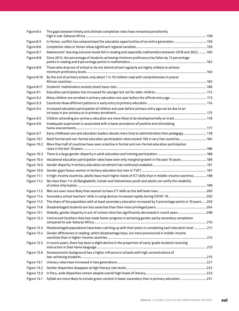 教育不平等仍然显著:富裕儿童完成高中教育的可能性约为贫困儿童的五倍;不同收入组和地区在义务年限、免费教育年限及入学率上存在明显差距,表格与区域统计反复显示高收入国家接近满额指标,而低收入国家在多项指标上远落后。
