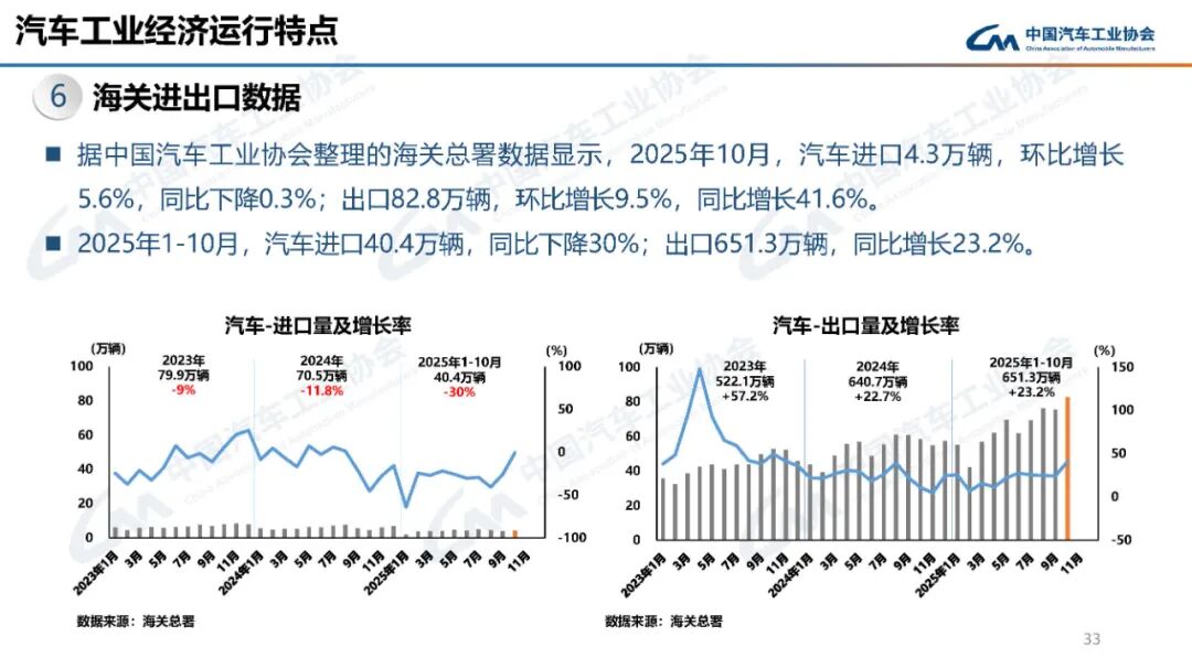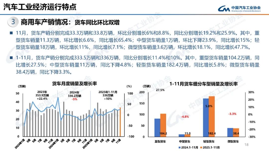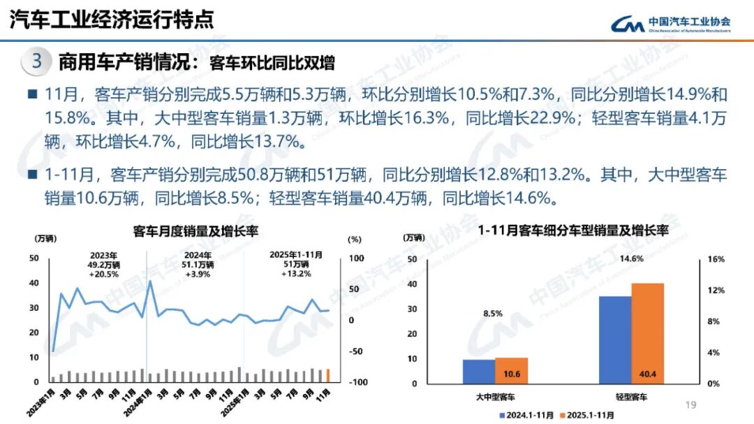中汽协:2025年11月汽车工业产销情况 据中国汽车工业协会分析,11月,汽车产销延续良好表现。企业抢抓政策窗口期,生产供给依然保持较快节奏,在高基数基础上,产销环比、同比均实现增长。其中,乘用车市场运行平稳,商用车市场持续向好,新能源汽车表现强劲,汽车出口较快增长。 更多阅读:中国汽车工业协会:2023年7月汽车工业产销情况中国汽车工业协会:2023年8月汽车工业产销情况中国汽车工业协会:2022年11月汽车工业产销情况中国汽车工业协会:2023年3月汽车工业产销情况中国汽车工业协会: 2023年5月汽车工业产销情况中国汽车工业协会:2023年1月汽车工业产销情况中国汽车工业协会:2022年汽车工业产销情况中汽协:2024年4月中国品牌乘用车销售情况简析中汽协:2024年1-4月前十位MPV生产企业销售情况简析中汽协:2024年1-4月前十位SUV生产企业销售情况简析中汽协: 2024年1-4月前十位轿车生产企业销售情况简析中汽协:2022年7月汽车工业产销情况简述中汽协:2022年11月汽车产销分别达到238.6万辆和232.8万辆中汽协:2024年5月汽车出口情况简析中汽协:2024年5月乘用车产销情况简析