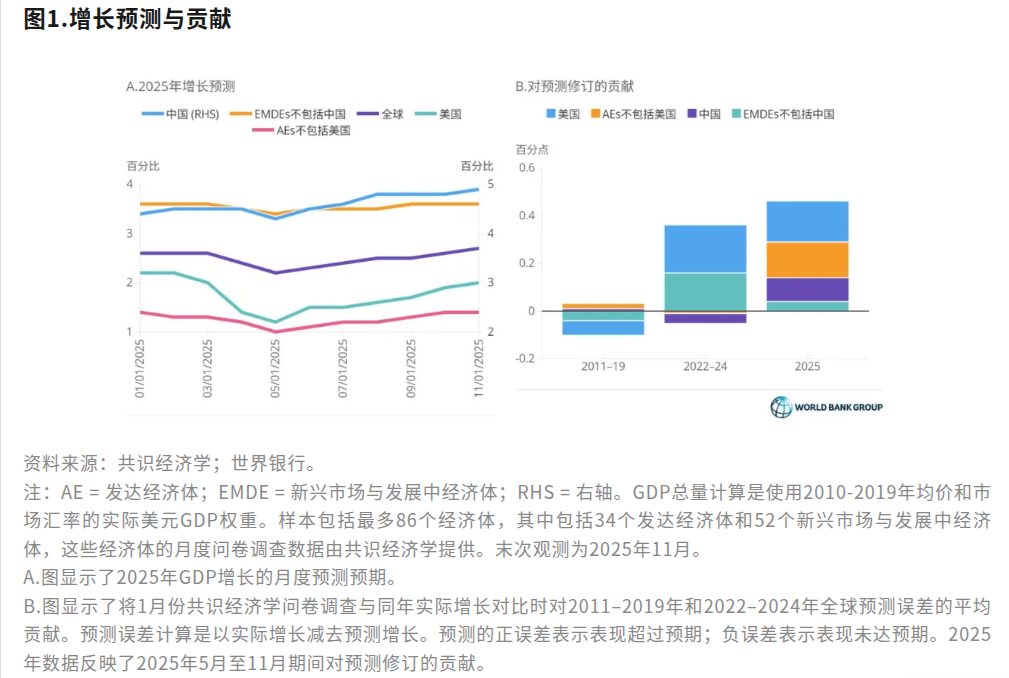 除中国外的新兴经济体与发展中国家预计将维持约3.5%的经济增速。得益于政策扶持缓解了地产低迷的冲击,中国经济增长预期获得调升。这些发展中经济体的韧性源于服务业活力、出口市场多元化、通胀压力缓和及低利率环境,这些因素共同促成了优于预期的经济表现。