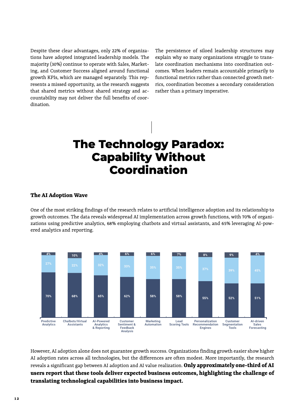 建议路径:将增长责任、预算与指标由职能分配转向以客户生命周期为中心的共享框架,优先投入能创造跨职能可视性与统一客户旅程的技术与流程(例如统一客户旅程映射,目前仅27%采用,但与更高协调与更好增长结果关联显著)。