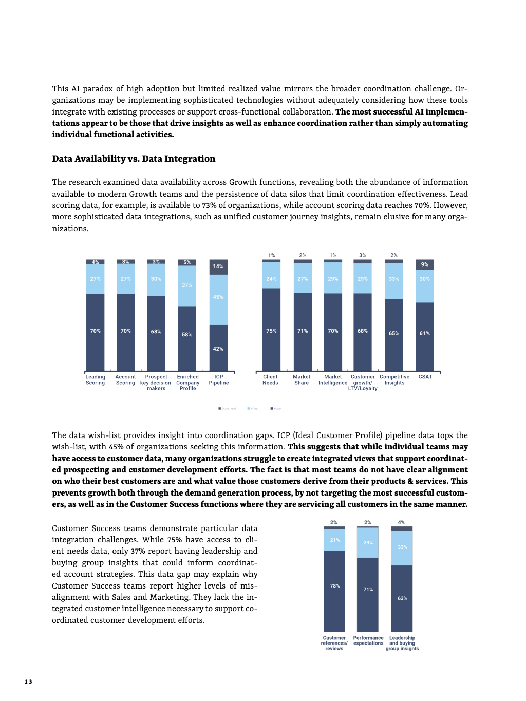 数据可用性存在割裂:比如线索评分在73%组织可用、账户评分70%,但更高级的统一客户旅程洞察与ICP管线数据仍为多数组织的缺失(ICP数据为45%愿望清单)。采用“跨全旅程”数据的团队在增长预期上明显更积极(19%对11%)。