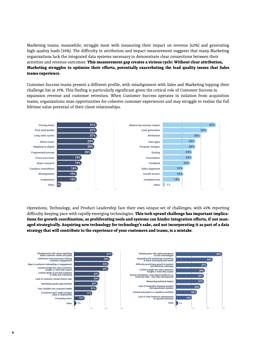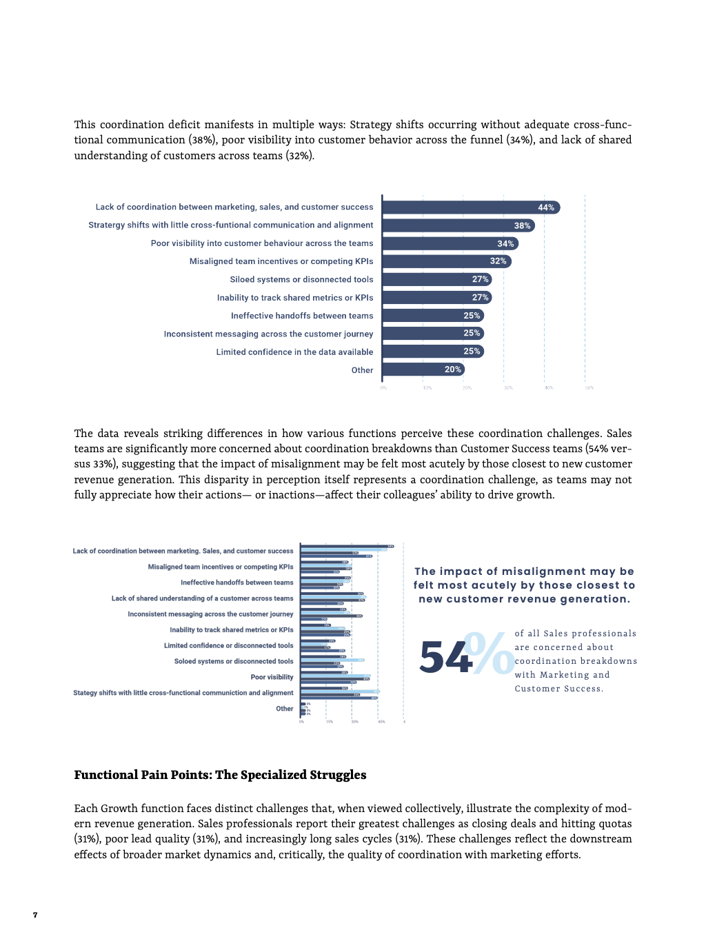 内部障碍仍显著:44%将“营销、销售与客户成功之间缺乏协调”列为最大的内部阻碍;销售对协调断层的担忧最为强烈,54%的销售表示深切关注此类问题。