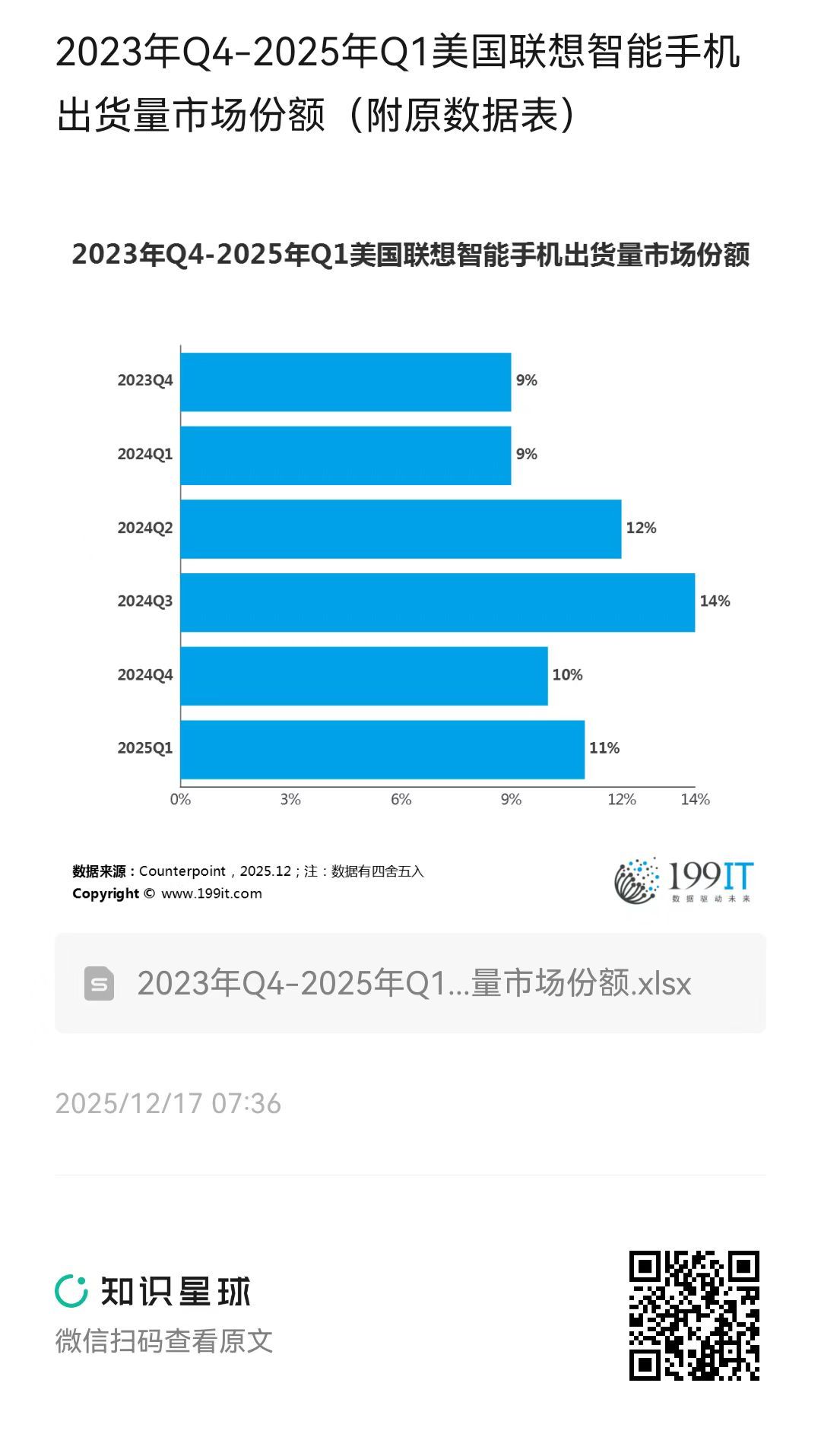 2023年Q4-2025年Q1美国联想智能手机出货量市场份额(附原数据表) ​​​