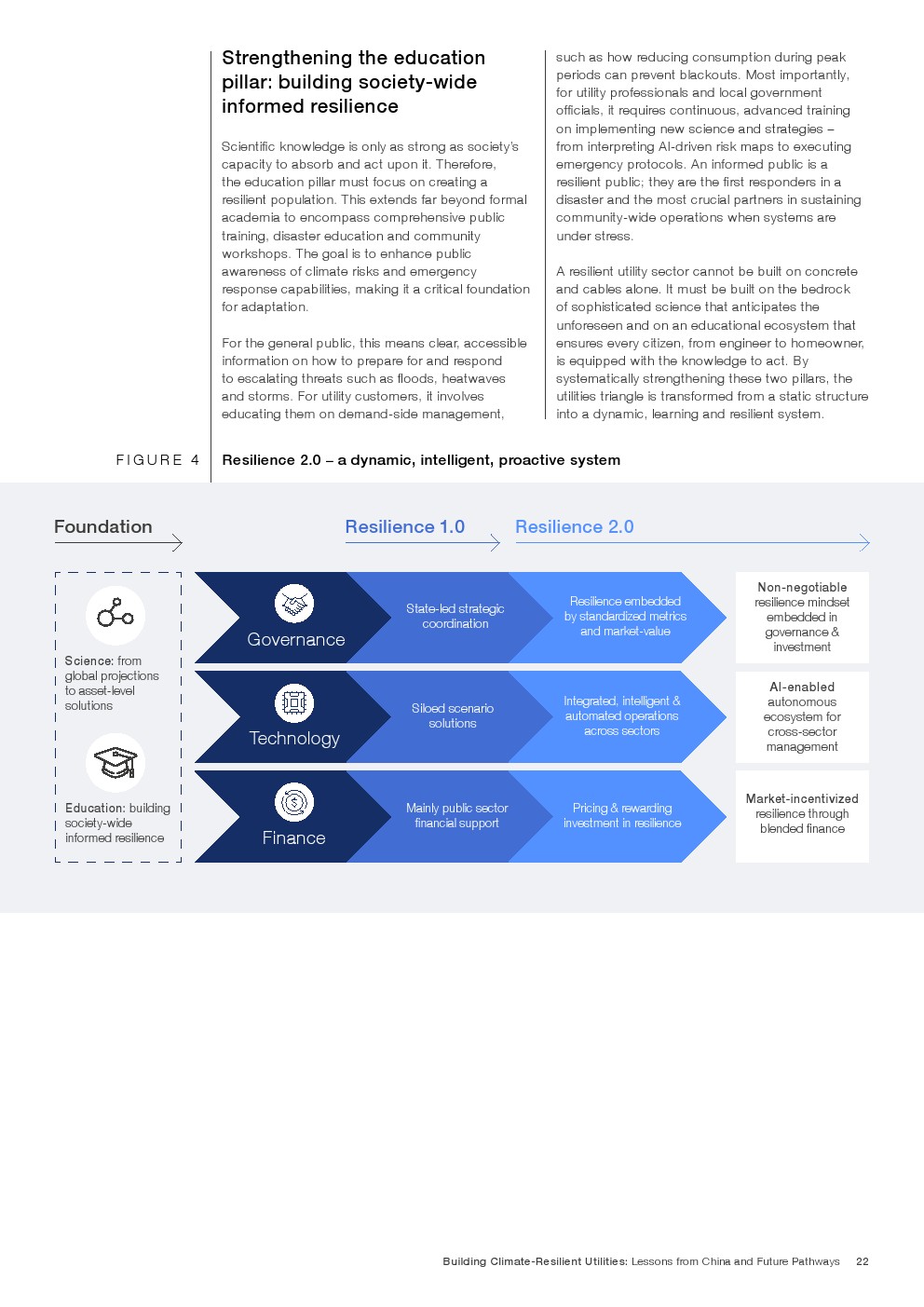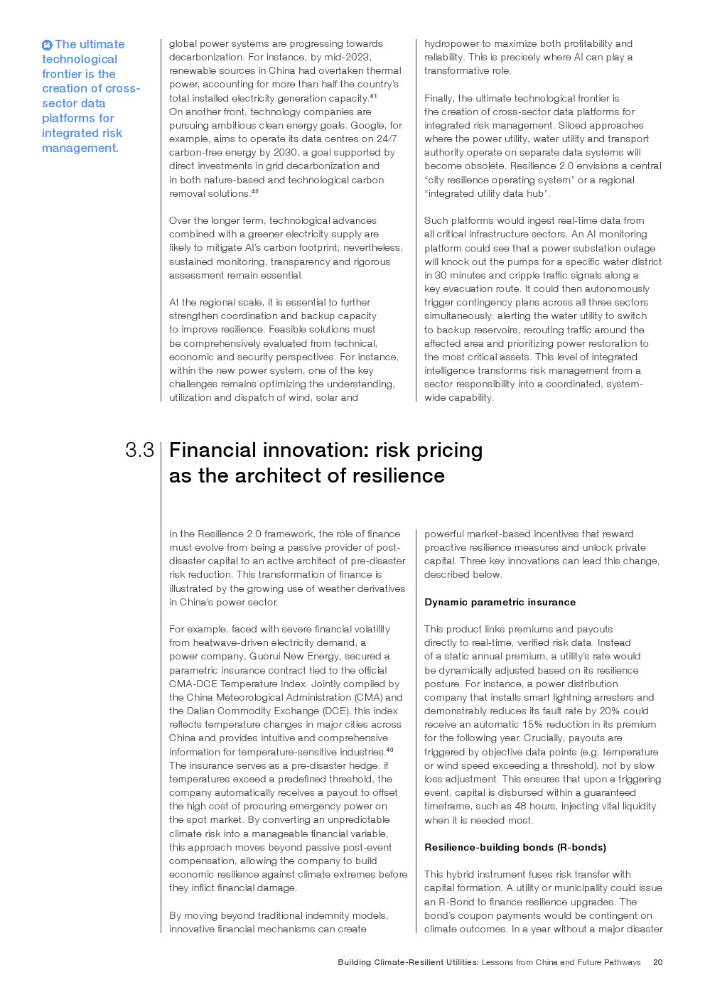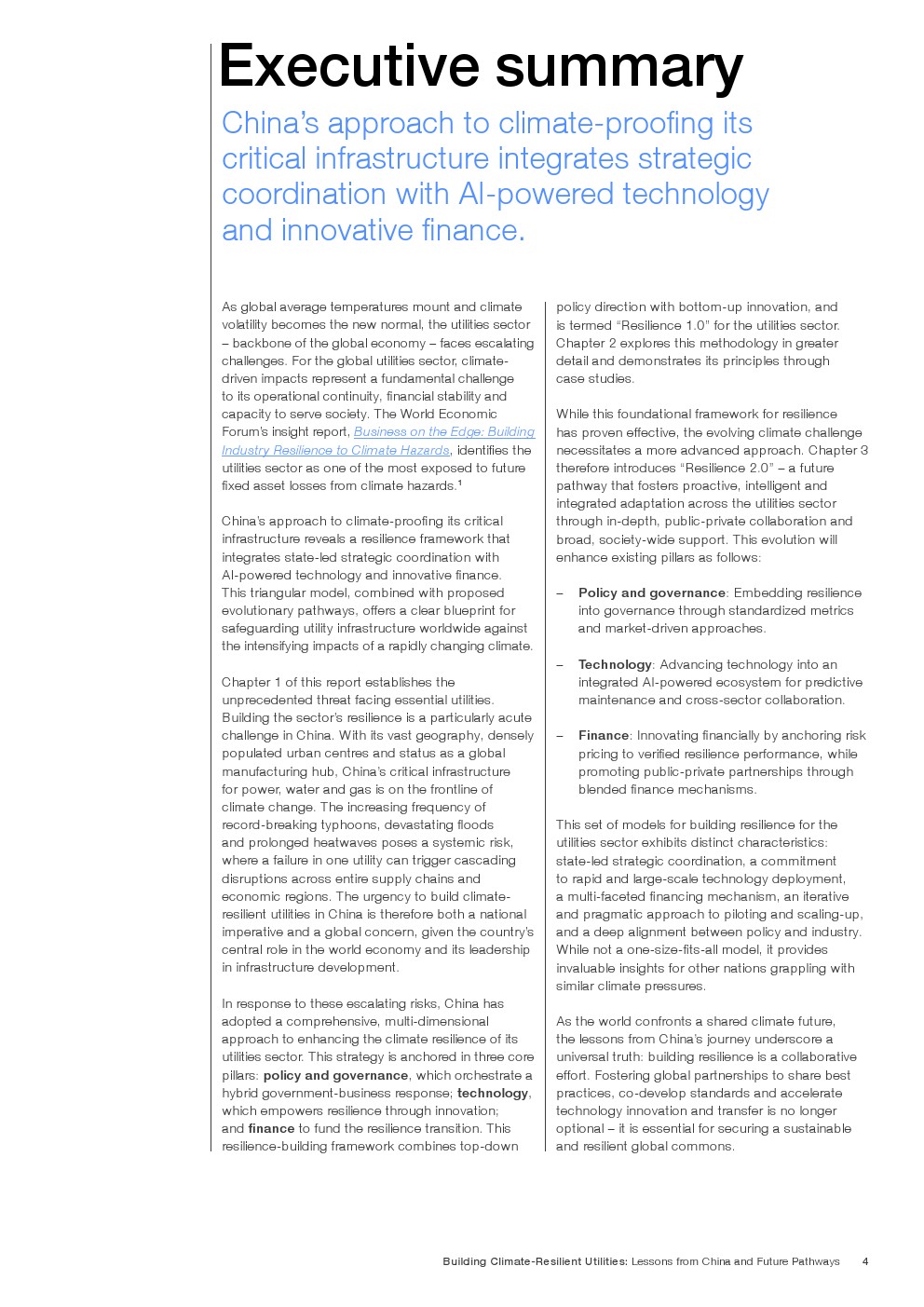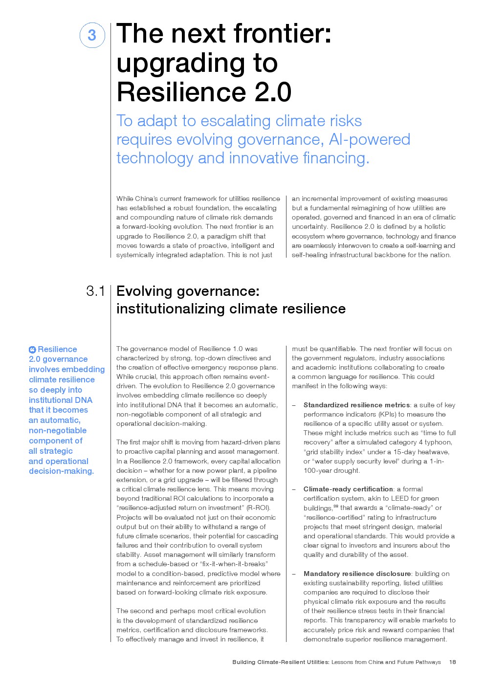 在既有成效基础上,报告提出迈向韧性2.0的演进路径,即将气候风险嵌入资本配置、资产管理与金融定价体系。通过以AI为核心的预测性维护、跨部门数据协同,以及参数化保险与风险定价机制,韧性由“应急能力”升级为“内生属性”。
