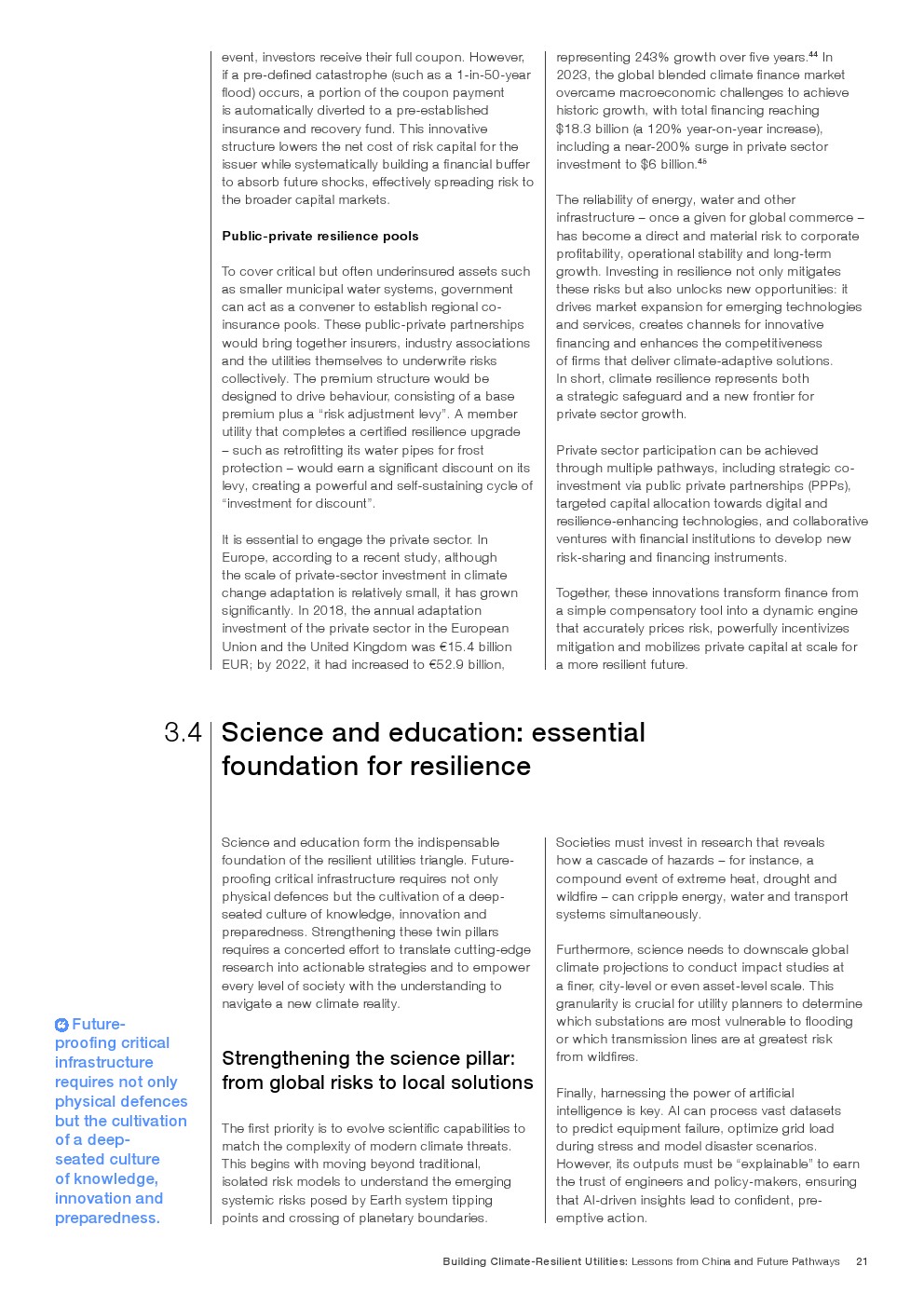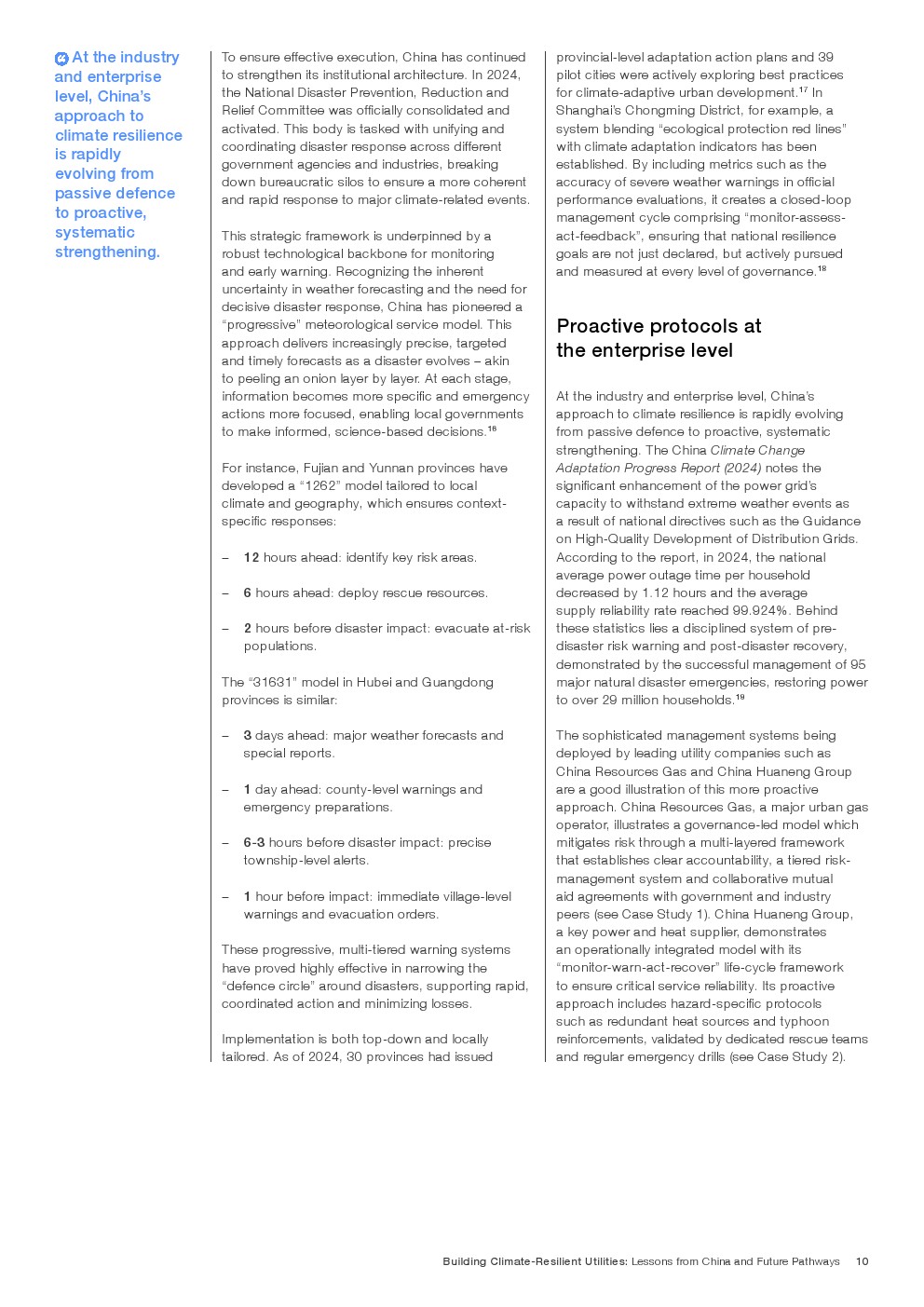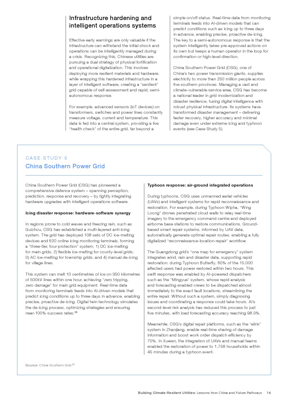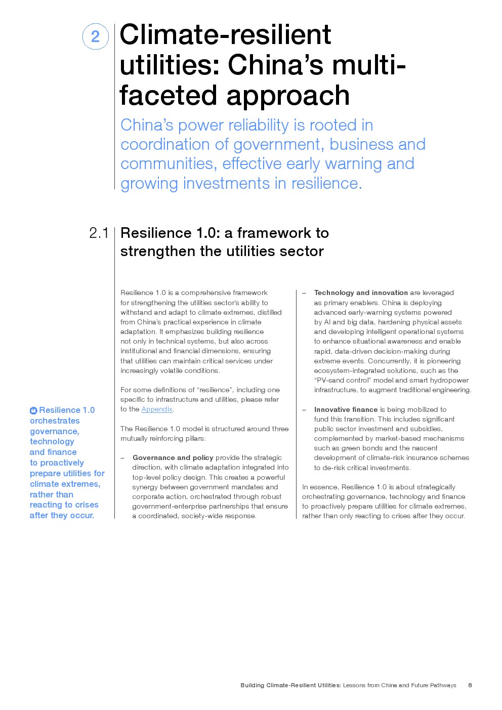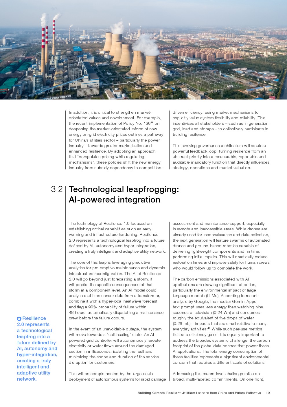 在既有成效基础上,报告提出迈向韧性2.0的演进路径,即将气候风险嵌入资本配置、资产管理与金融定价体系。通过以AI为核心的预测性维护、跨部门数据协同,以及参数化保险与风险定价机制,韧性由“应急能力”升级为“内生属性”。