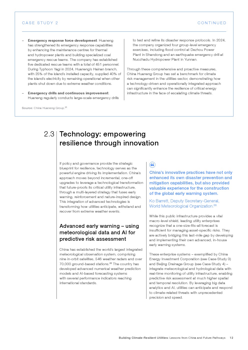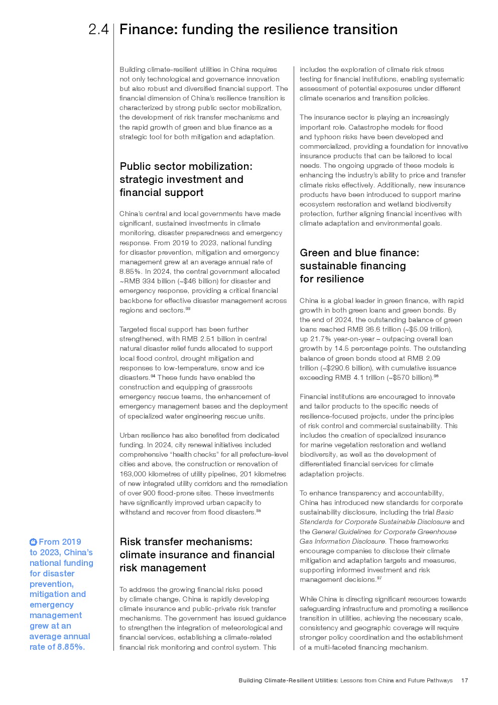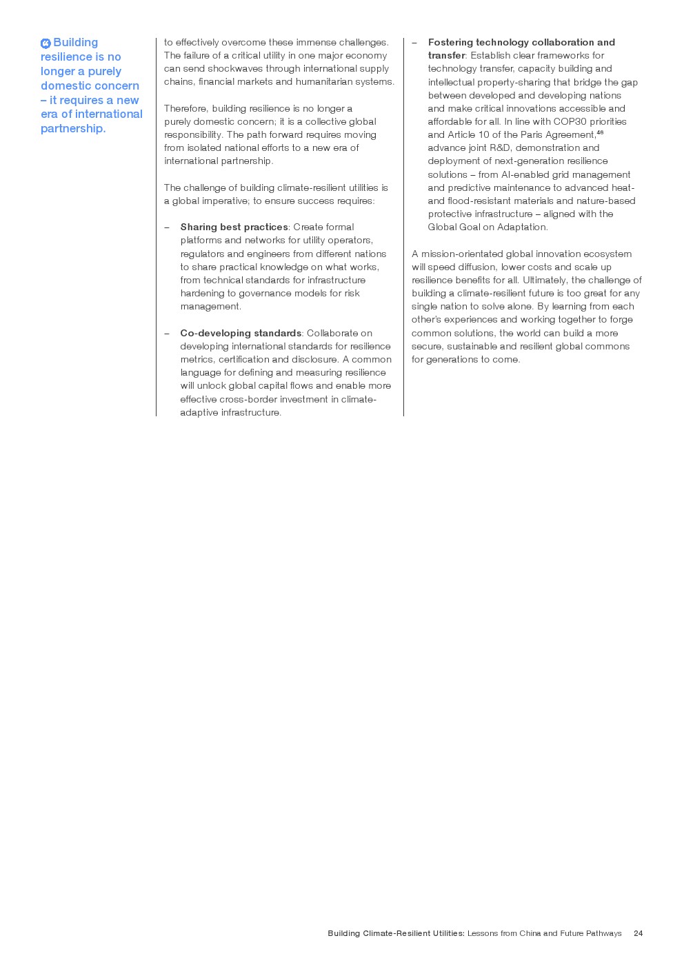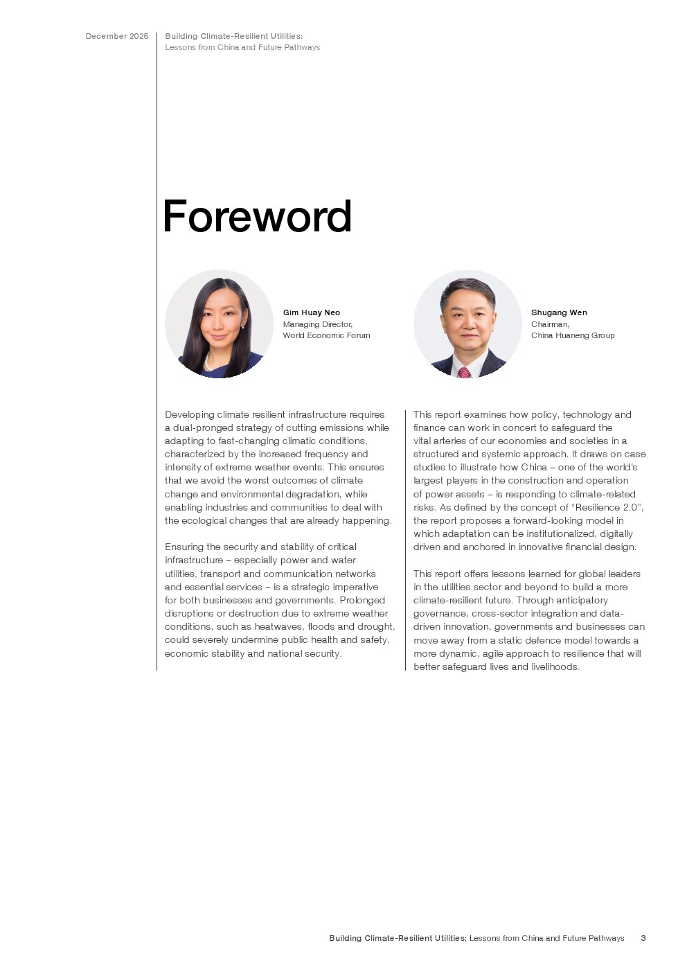 在既有成效基础上,报告提出迈向韧性2.0的演进路径,即将气候风险嵌入资本配置、资产管理与金融定价体系。通过以AI为核心的预测性维护、跨部门数据协同,以及参数化保险与风险定价机制,韧性由“应急能力”升级为“内生属性”。