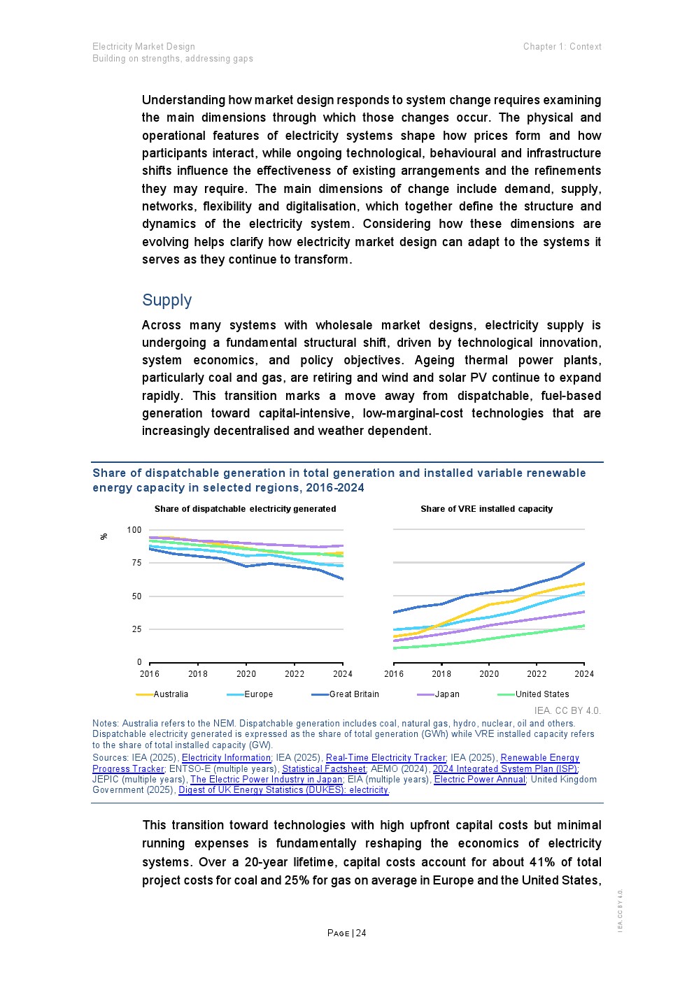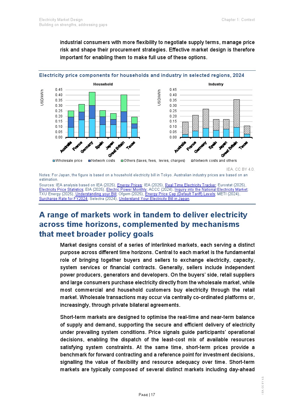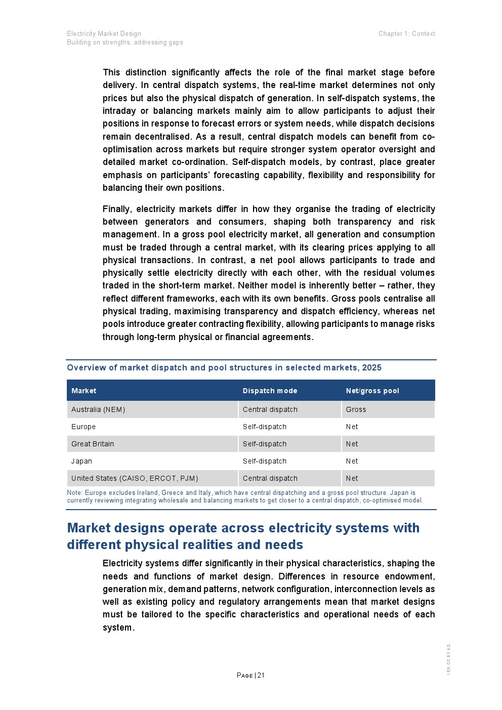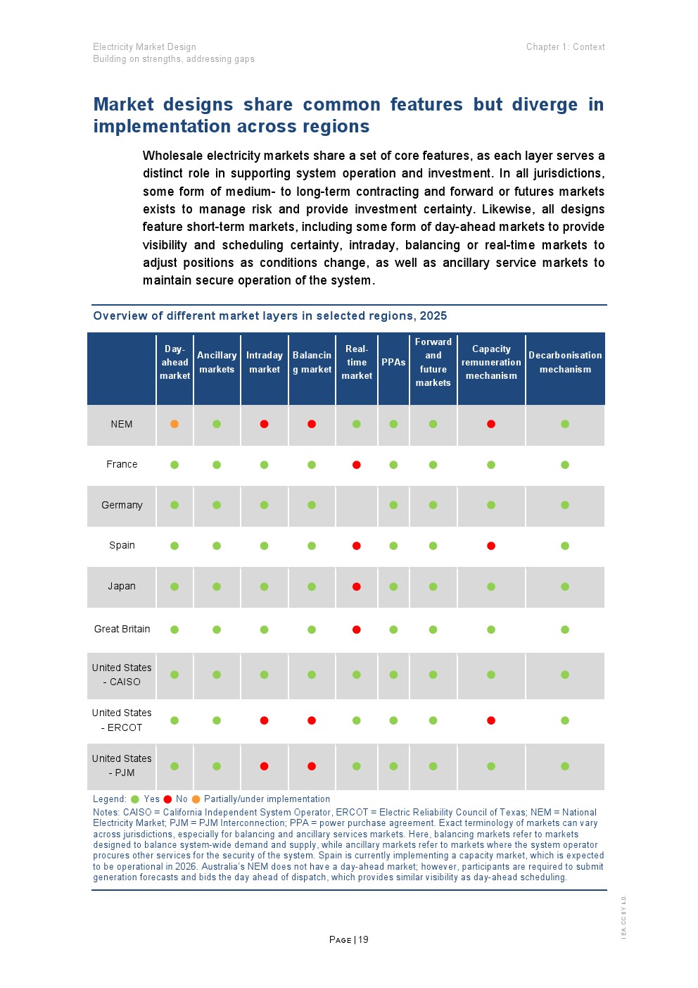 国际能源署最新发布的《Electricity Market Design》报告,对欧洲、美国、日本与澳大利亚等主要电力市场进行了系统性评估。报告指出,随着可再生能源占比快速提升、电力需求重新进入增长通道以及系统复杂性上升,电力市场设计已成为影响能源安全、价格稳定与投资效率的核心制度变量。若市场机制调整滞后,系统运行不确定性和总体成本将明显上升。