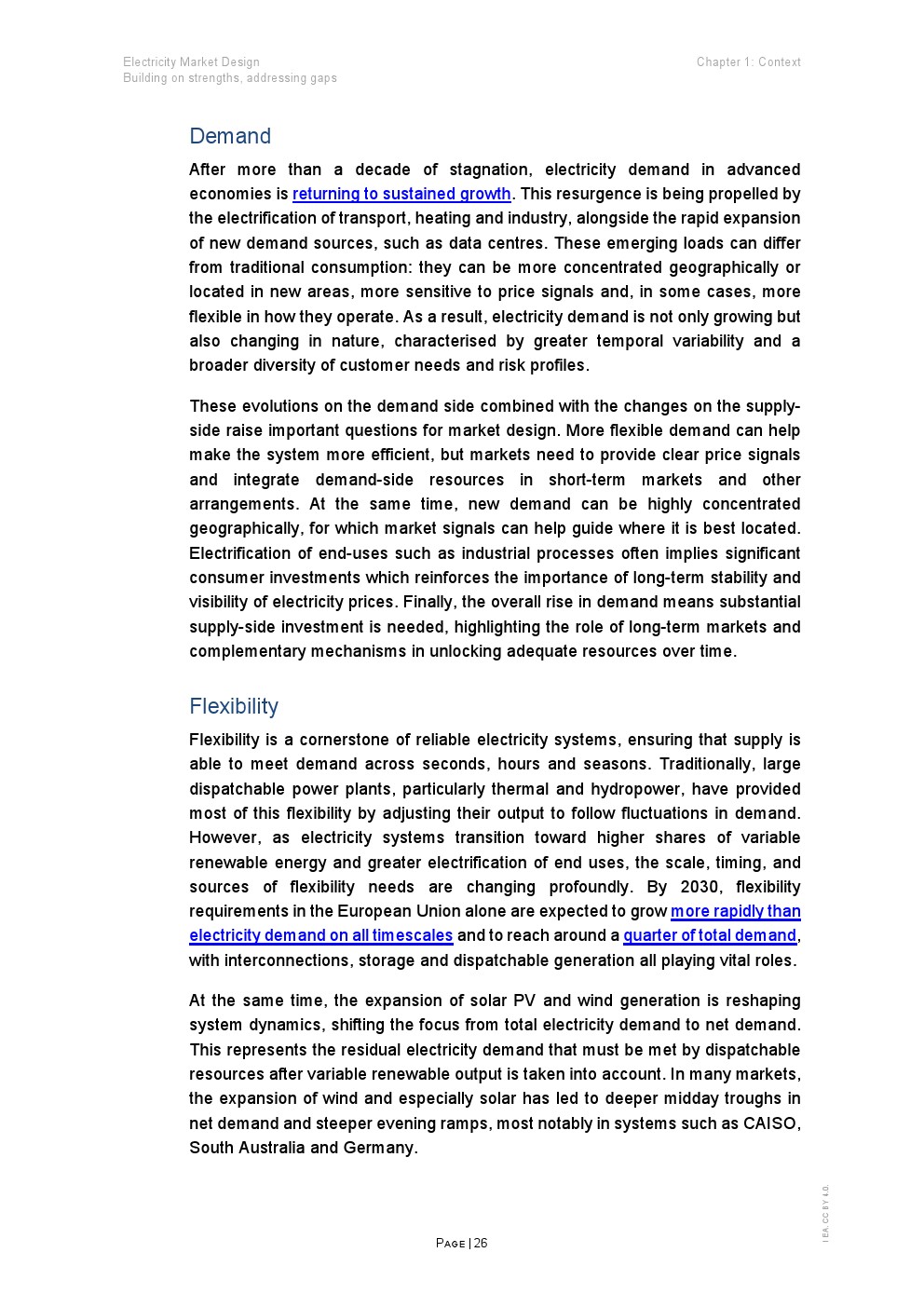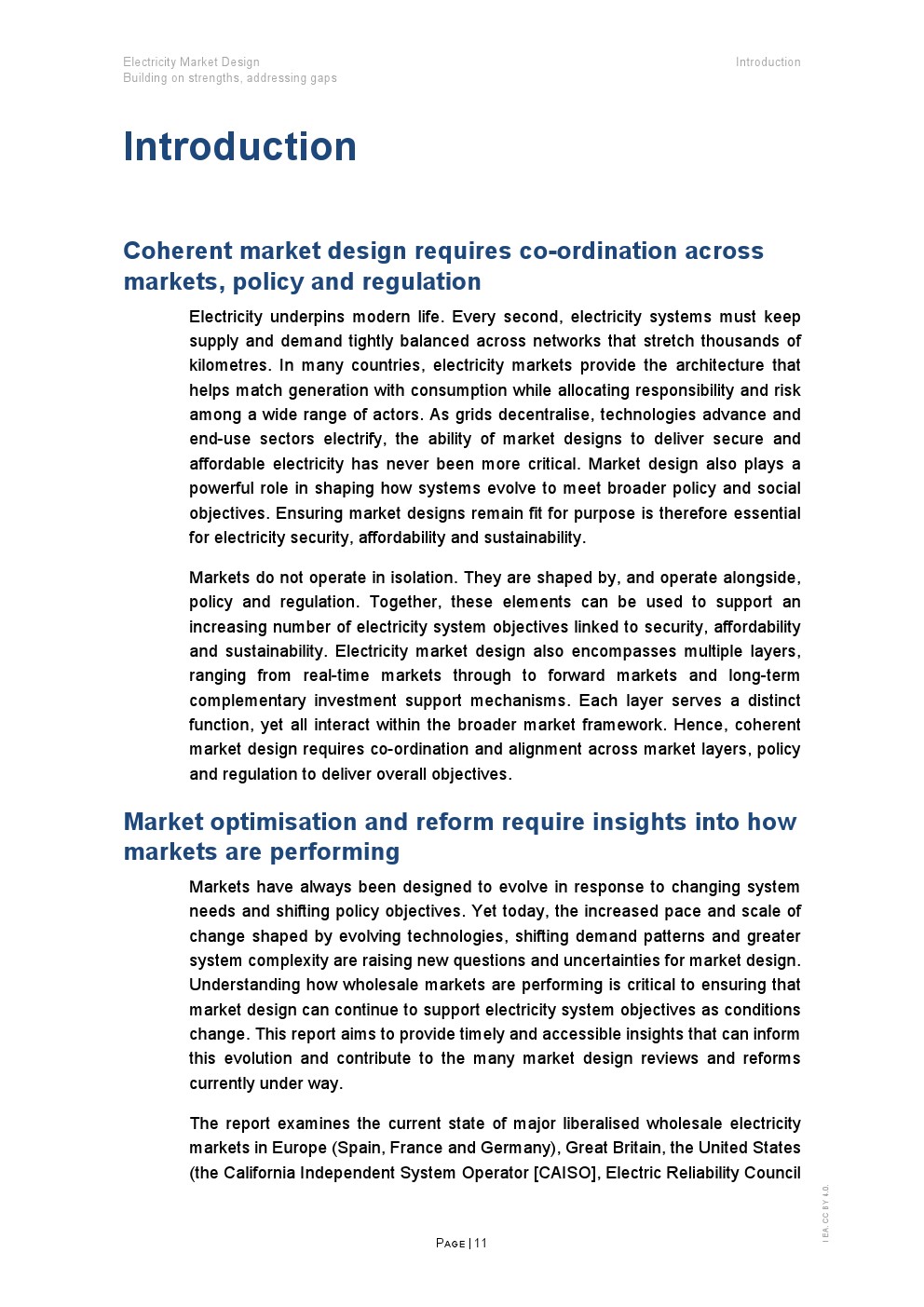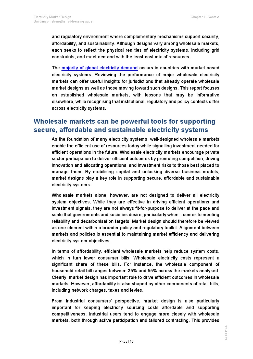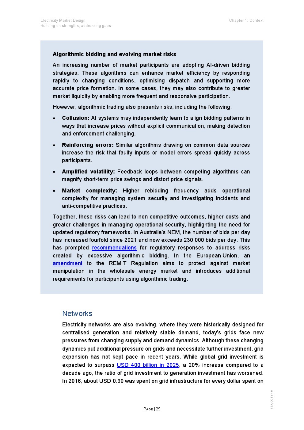 国际能源署最新发布的《Electricity Market Design》报告,对欧洲、美国、日本与澳大利亚等主要电力市场进行了系统性评估。报告指出,随着可再生能源占比快速提升、电力需求重新进入增长通道以及系统复杂性上升,电力市场设计已成为影响能源安全、价格稳定与投资效率的核心制度变量。若市场机制调整滞后,系统运行不确定性和总体成本将明显上升。