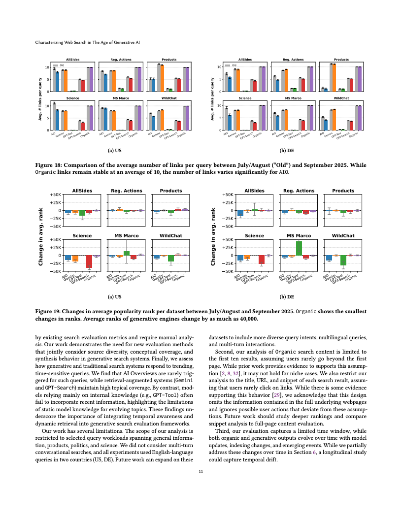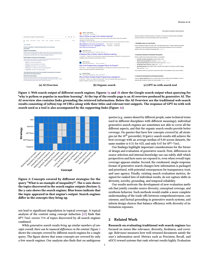 在内容维度上,生成式搜索的输出从“列表”转为“叙事”。AIO平均生成1656字符的答案,Gemini更长达2500字符,而GPT-Tool仅约1000字符。研究利用LLM主题识别模型(LLooM)分析发现,尽管总体主题覆盖度相近(传统搜索为0.78,GPT-Search为0.78,Gemini为0.77),但不同系统呈现的概念集合重叠度低,信息呈“多极分化”。在歧义性强的查询(如同名人物或多义词)中,传统搜索仍优于生成式引擎,前者对模糊问题的主题覆盖达67%,后者则降至48%。