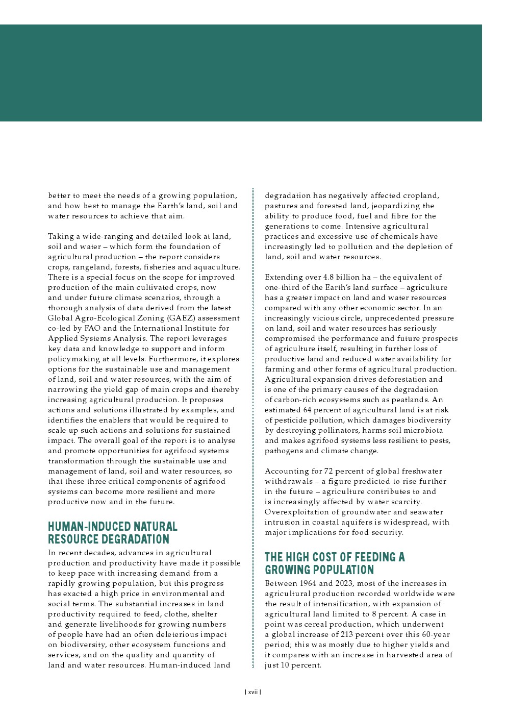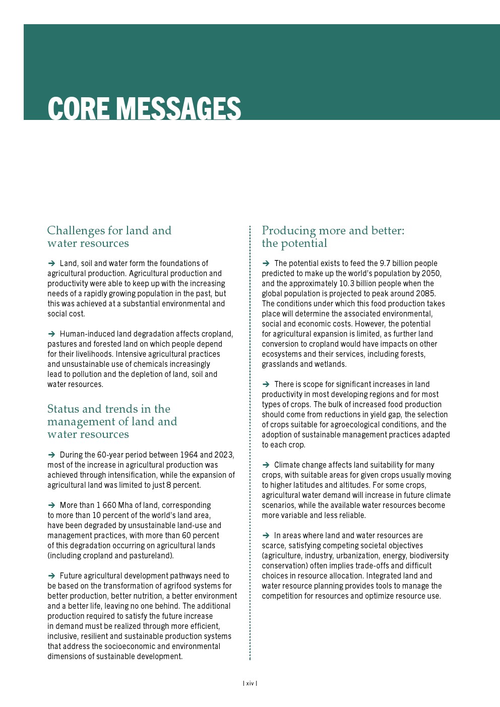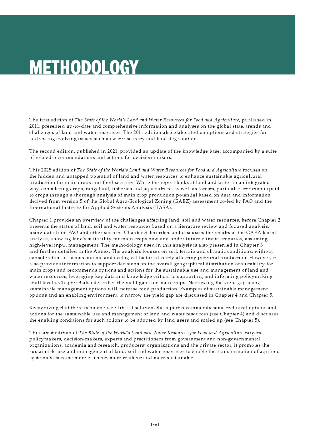 尽管地球自然资源面临挑战规模巨大,但若以可持续方式管理和实践,农业仍有潜力满足全球不断增长人口的需求——预计人口到2050年将增至97亿,并在2085年达到103亿的峰值。可持续农业实践可以直接改善土地、土壤和水资源的状况,并产生宝贵的生态系统效益。同时,对土地、土壤和水资源的可持续管理可以在气候变化的减缓和适应两方面做出重大贡献。