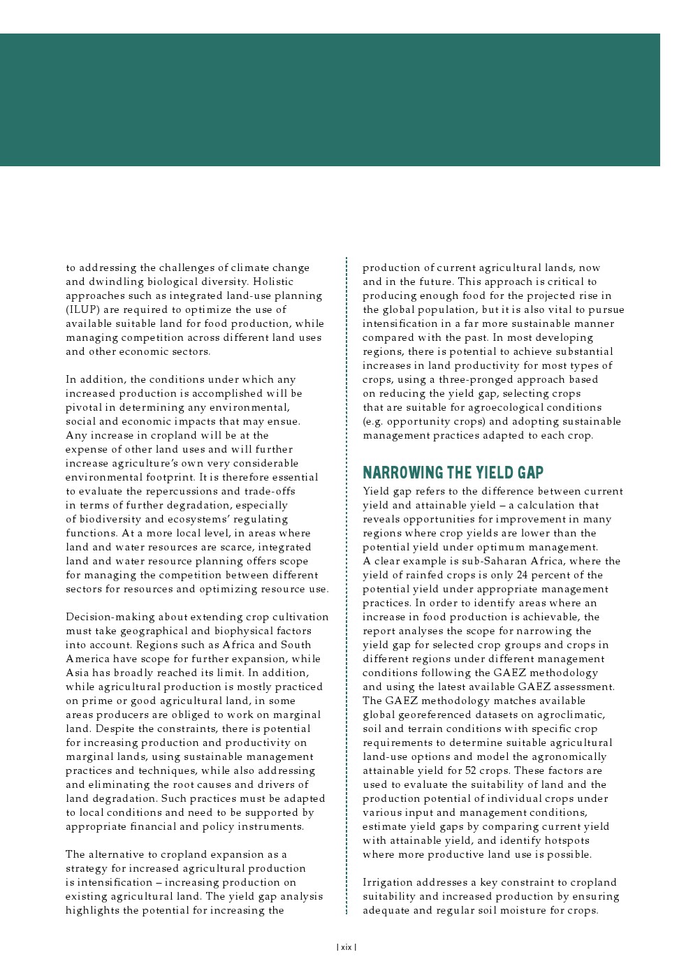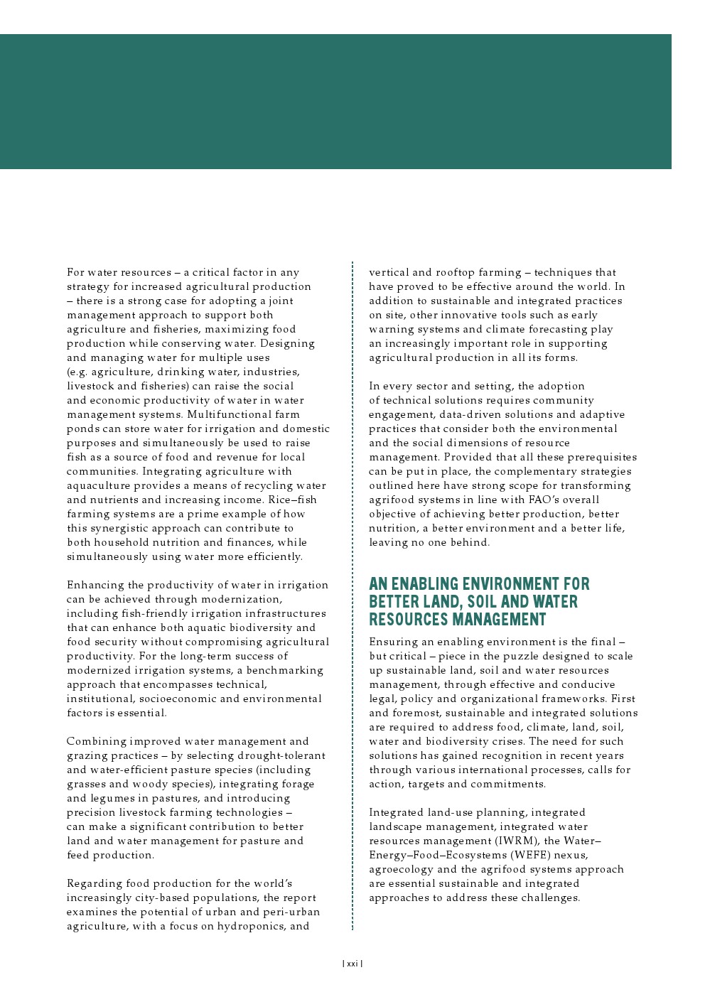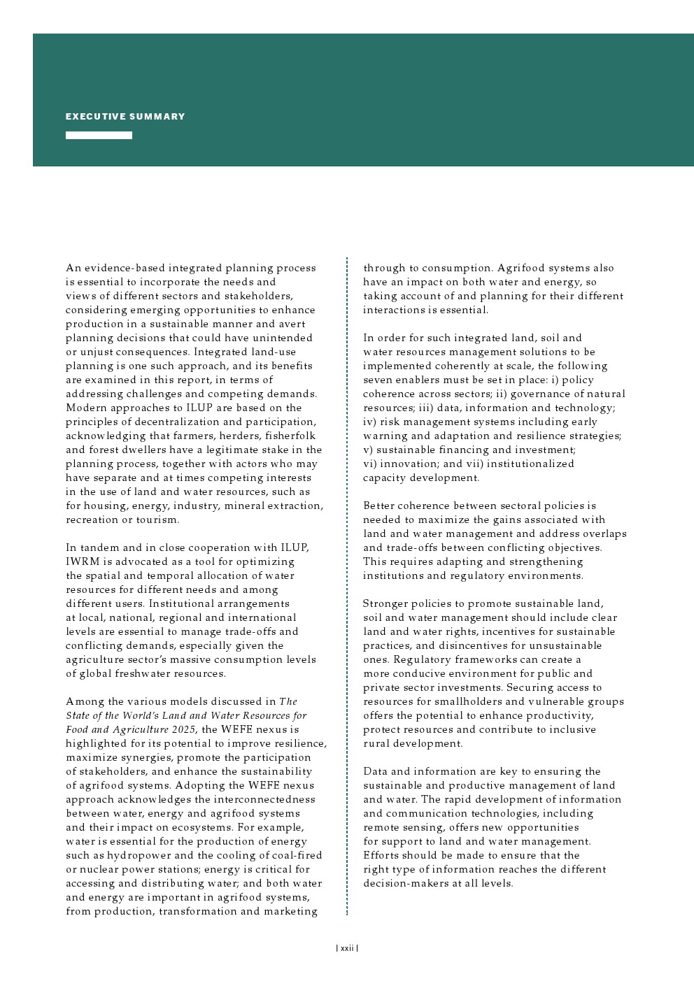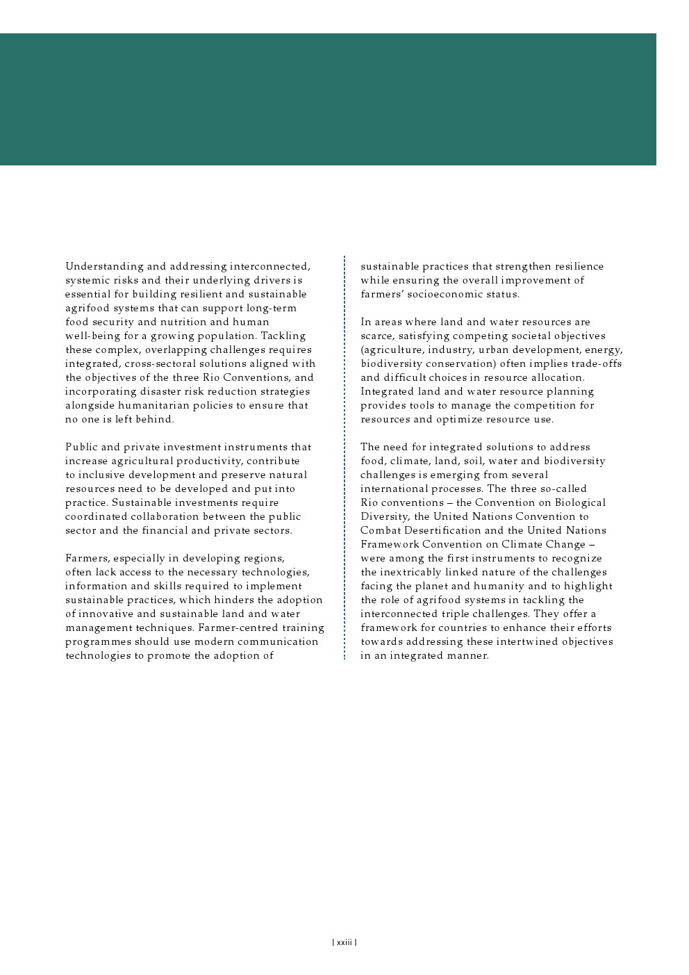 任何旨在实现可持续农业生产及土地与水资源管理的战略,都需要对这些关键资源的管理方式进行深刻转变,并以准确的信息和资金为支撑,辅以自然资源管理行业之外的协同努力和举措。在气候变化这一具体且关键的领域,目前投资和气候融资不足的水平需要得到提升。同样重要的是要牢记,任何旨在减缓气候变化的措施都必须经过周密规划,以避免适应不当或产生意外后果,包括对稀缺水资源造成额外压力或导致土地和土壤资源的进一步退化。