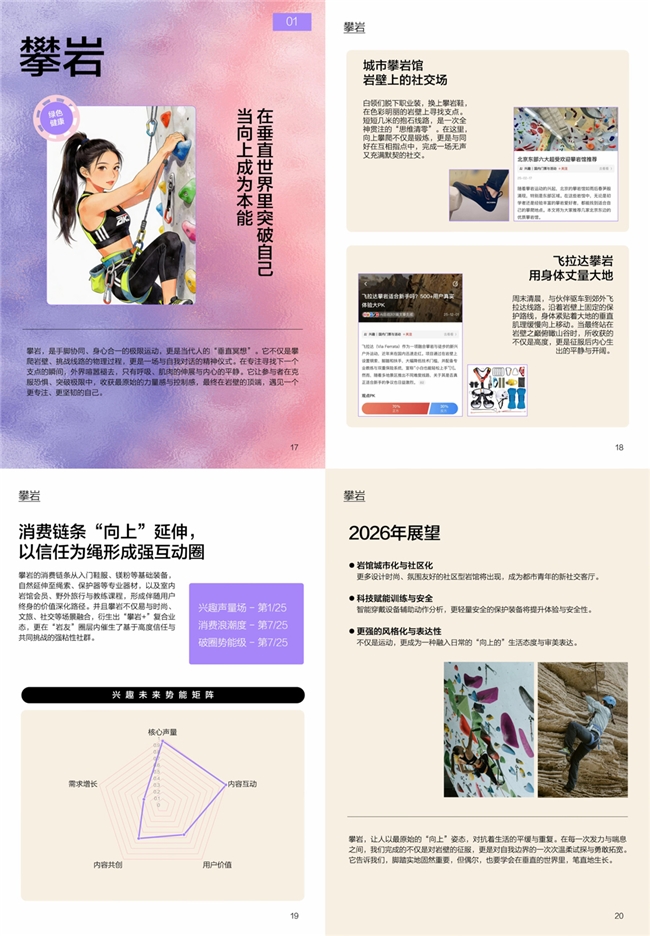 基于平台兴趣生态,报告构建了六大维度兴趣坐标系:技术驱动、精准适配、场景融合、绿色健康、文化赋能和手工造物,完整解码兴趣属性。其中,前三者代表了兴趣在技术赋能与消费形态互动中形成的“现代面向”;后三者则指向兴趣背后关乎健康、文化认同与创造表达的“永恒内核”。这一框架不仅完整映射了平台兴趣的属性谱系,也为理解兴趣消费的演变提供了结构化视角。
