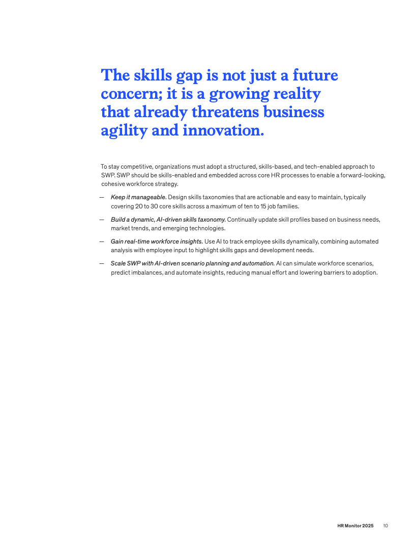 技能错配已从潜在风险转化为现实约束。32%的员工被HR认为不具备胜任当前岗位的全部技能,其中意大利高达39%。到2030年,生成式人工智能预计可自动化欧洲27%的工作时长,而问题解决能力、数据分析与AI相关技能已跻身未来最紧缺能力前列。然而,仅约30%的企业将技能数据真正纳入战略人力规划,技能管理与用人决策长期“各自为政”。
