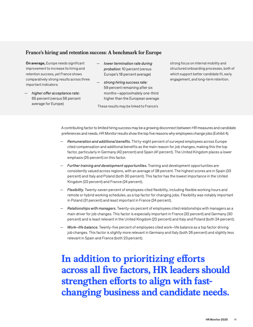 招聘市场呈现“表面宽松、结构紧张”的双重特征。欧洲整体岗位录用接受率仅56%,试用期离职率高达18%,两者叠加后,六个月留存的实际招聘成功率仅为46%。意大利表现最弱,仅40%。法国则形成鲜明对比,其接受率65%、试用期解约率10%,留存率接近60%,显示内部流动与规范化入职流程对招聘质量具有显著缓冲作用。