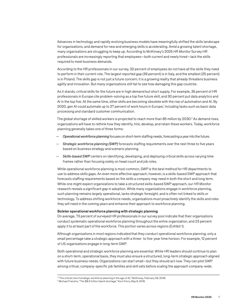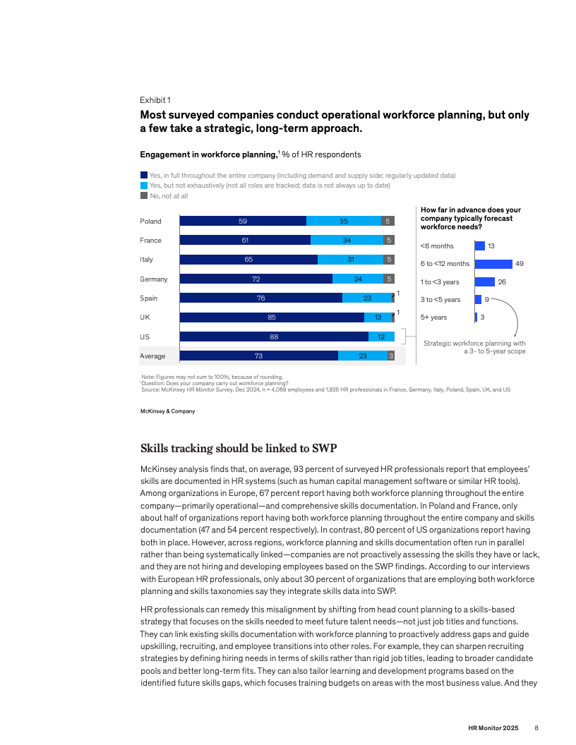 本报告基于对欧洲1,925家企业与4,000余名员工的调研,系统呈现了当前人力资源管理在战略、效率与员工体验之间的结构性错位。数据显示,尽管73%的企业已开展覆盖全公司的运营型人力规划,但真正具备三年以上战略视角的人力规划比例极低,美国仅为12%,欧洲多数国家也处于相近水平。这意味着人力资源配置仍以短期补位为主,难以应对生成式人工智能和技能结构快速变化所带来的中长期冲击。