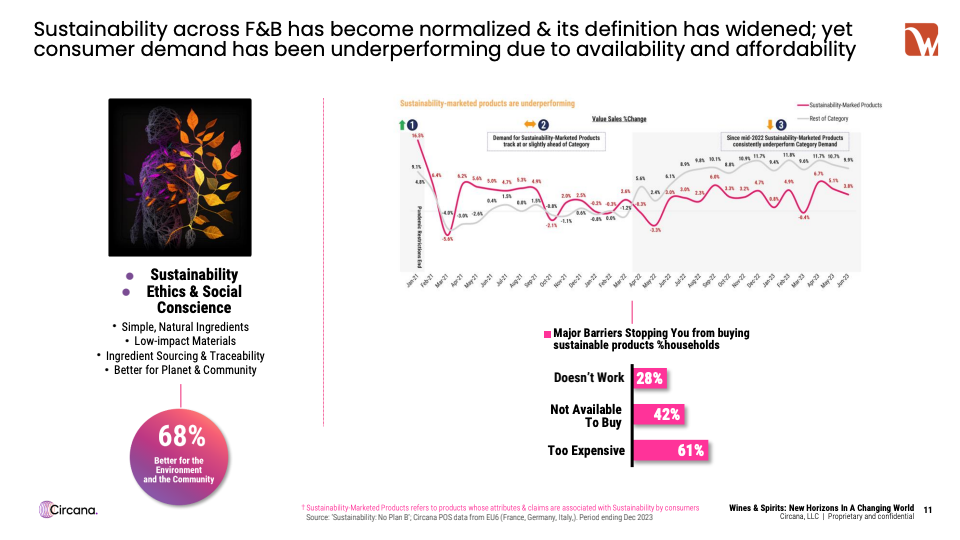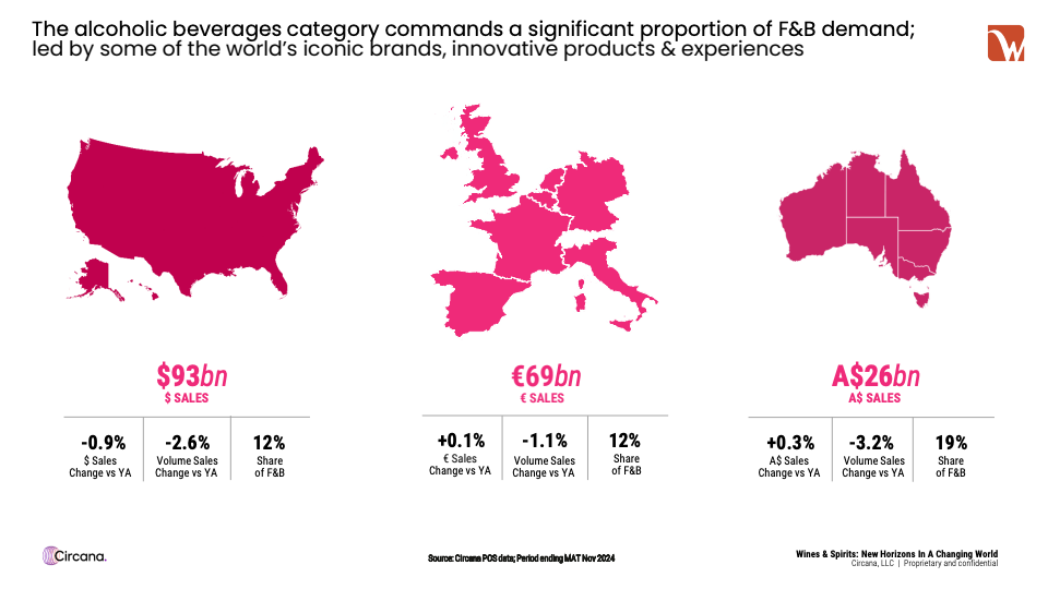 全球酒精饮料行业正进入一个由需求收缩与价值重构并存的新阶段。根据Circana数据,截至2024年11月,全球酒精饮料销售规模约930亿美元,占整体食品饮料消费的12%,但销量同比下降2.6%,销售额仅微降0.9%,显示增长主要由价格与结构性因素支撑而非真实需求扩张。以欧洲EU6市场为例,酒精饮料总规模约690亿欧元,占全部饮料消费的43%,但整体销量同比下滑1.1%,其中葡萄酒和香槟下降1.9%,烈酒降幅高达4.4%,仅RTD烈酒实现2.3%的正增长,未能对冲整体萎缩 。