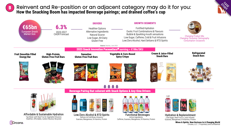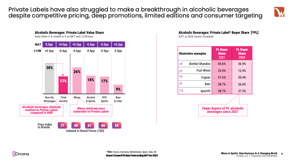在竞争格局上,酒类并未像其他快消品那样被自有品牌快速侵蚀。EU6市场中,酒精饮料自有品牌份额整体保持稳定,部分细分品类甚至下降,反映品牌资产与文化属性仍具防御力。但创新动能明显不足。2024年酒类新品数量同比减少9.2%,同时平均单价上涨15%,导致创新产品销量占比从高点的50%以上骤降至3.4%,价格敏感度上升正在抑制新品扩散。