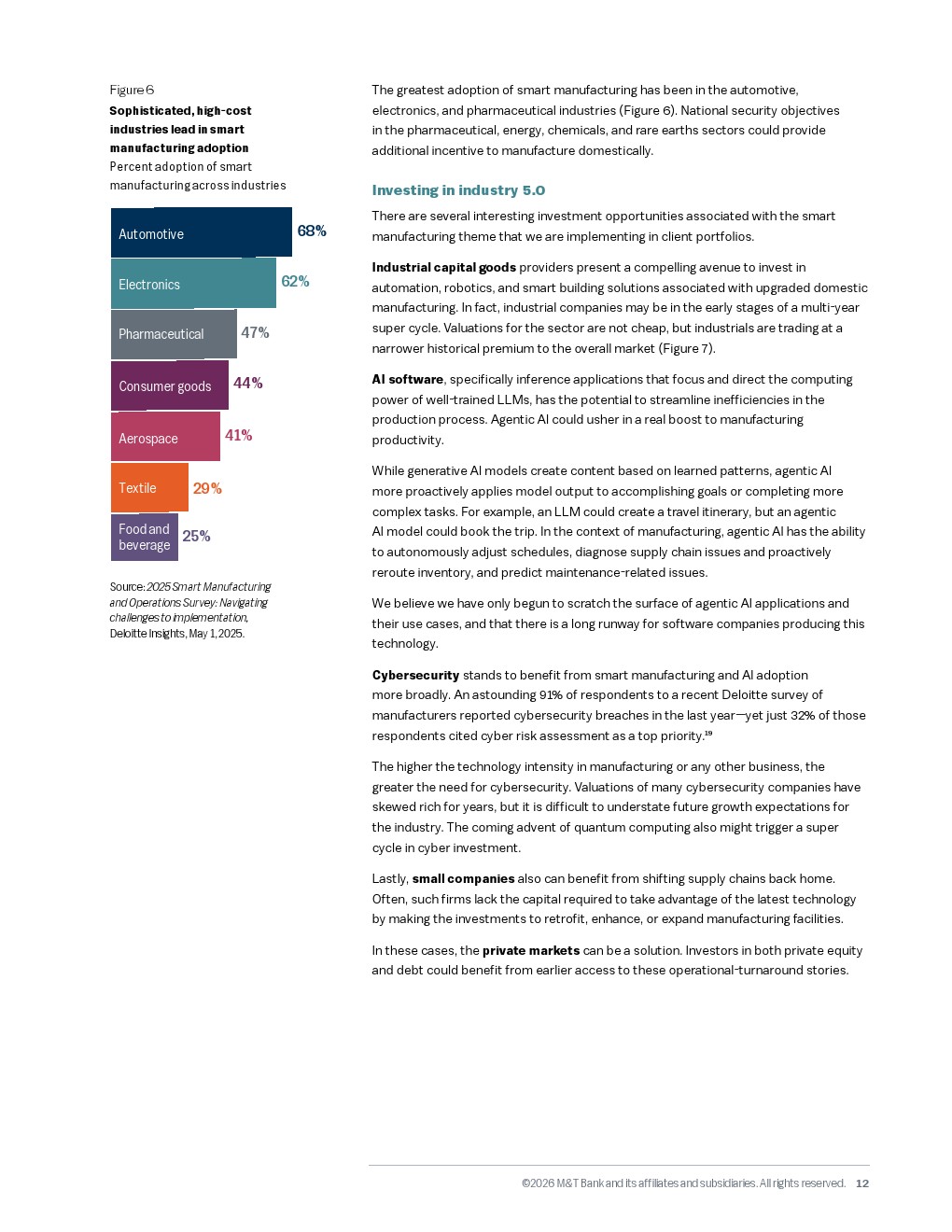 展望未来,资本市场将呈现出从高估值科技溢价向实际生产力红利转型的趋势。随着美联储预计在2026年中期将基准利率下调至百分之二点七五至百分之三的中心水平,市场重心将转向具备高现金流、强资产负债表的优质企业。在公共市场高度集中、标普五百指数前十大权重股占比创二十六年新高的背景下,主动管理与私募市场将迎来回归。能够率先通过智能制造克服劳动力成本障碍,并在人工智能投资回报周期中实现变现的企业,将成为新一轮长周期增长的领航者。