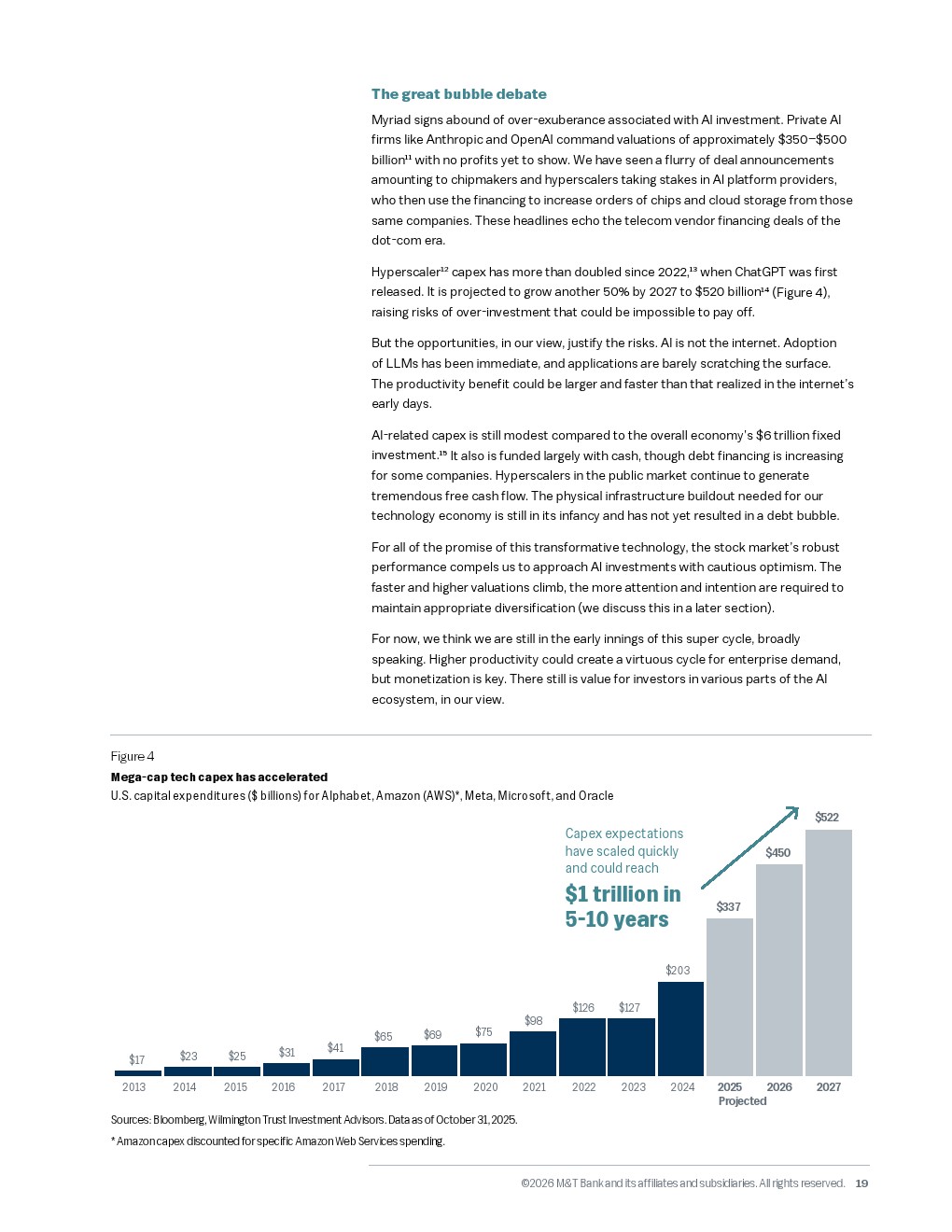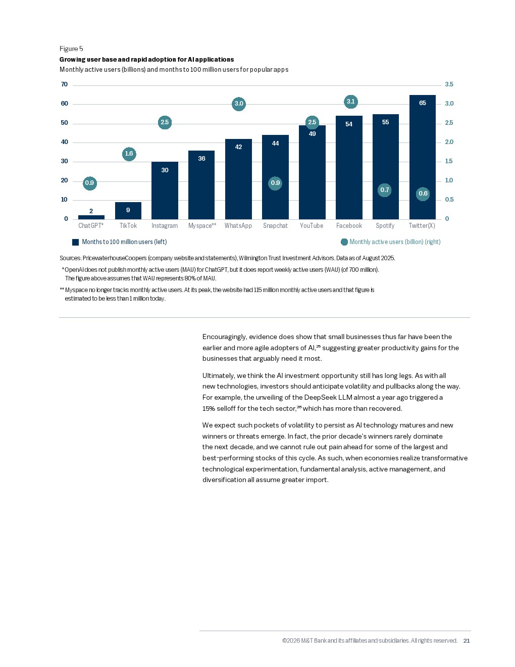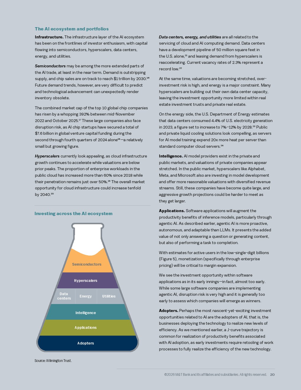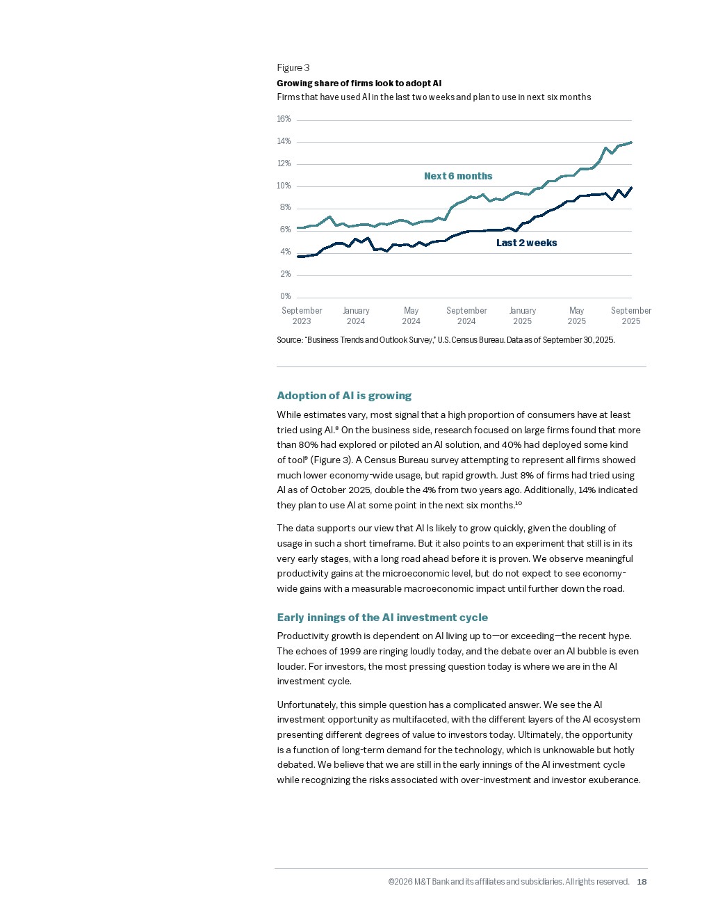 劳动力市场的结构性短缺成为生产力跃迁的倒逼力量。受老龄化影响,美国原生人口预计从2031年起进入负增长区间,而当前百分之四点三的低失业率暗示几乎没有闲置产能。尽管如此,人工智能的渗透正在加速,截至2025年十月,已有百分之八的企业尝试使用人工智能,预计未来半年内这一比例将升至百分之十四。虽然短期内二十二至二十五岁的软件工程师岗位因人工智能减少了百分之二十,但长期来看,人工智能有望像当年的互联网一样,为未来十年贡献百分之一至百分之一点五的年度生产力增长。