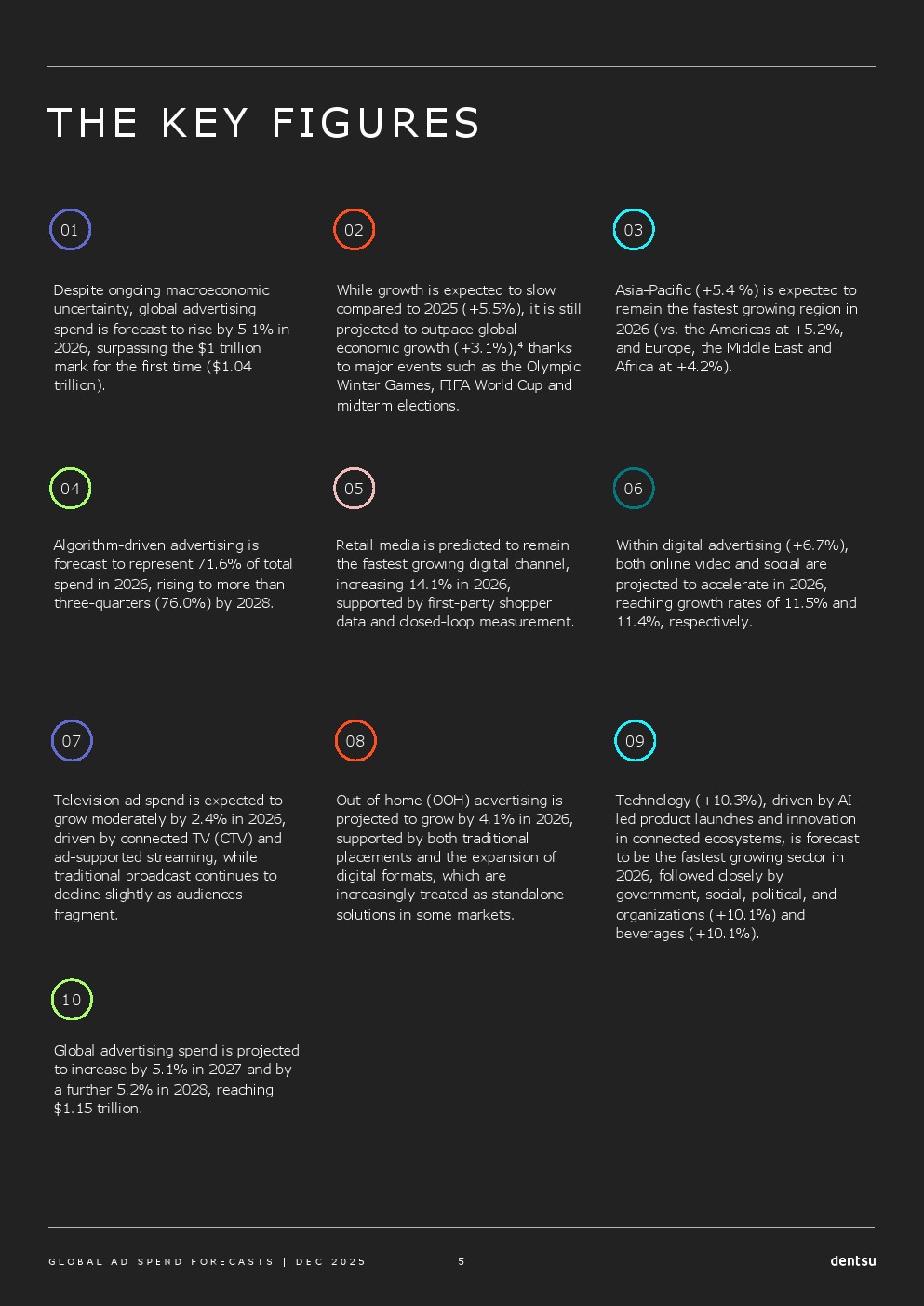 2026年,全球广告支出预计同比增长5.1%,总规模首次突破1万亿美元,达到1.04万亿美元。这一增速虽较2025年的5.5%略有放缓,但显著高于同期3.1%的全球经济增速,表明广告投资已从顺周期变量转向更具韧性的结构性投入。大型体育赛事与政治周期构成关键外生推动力。
