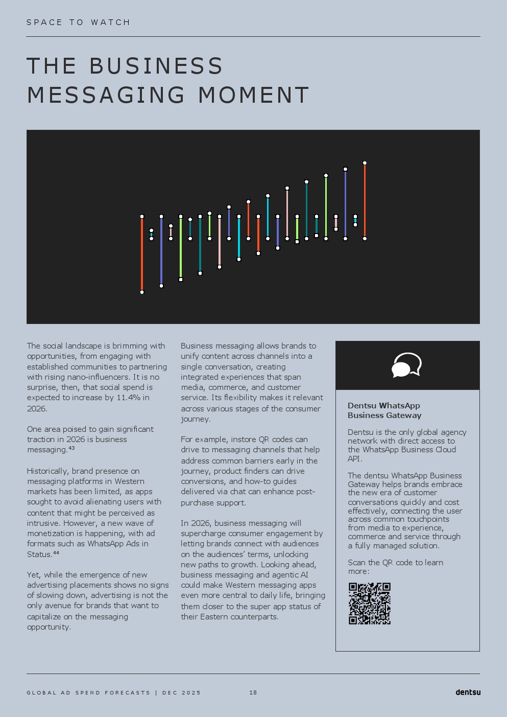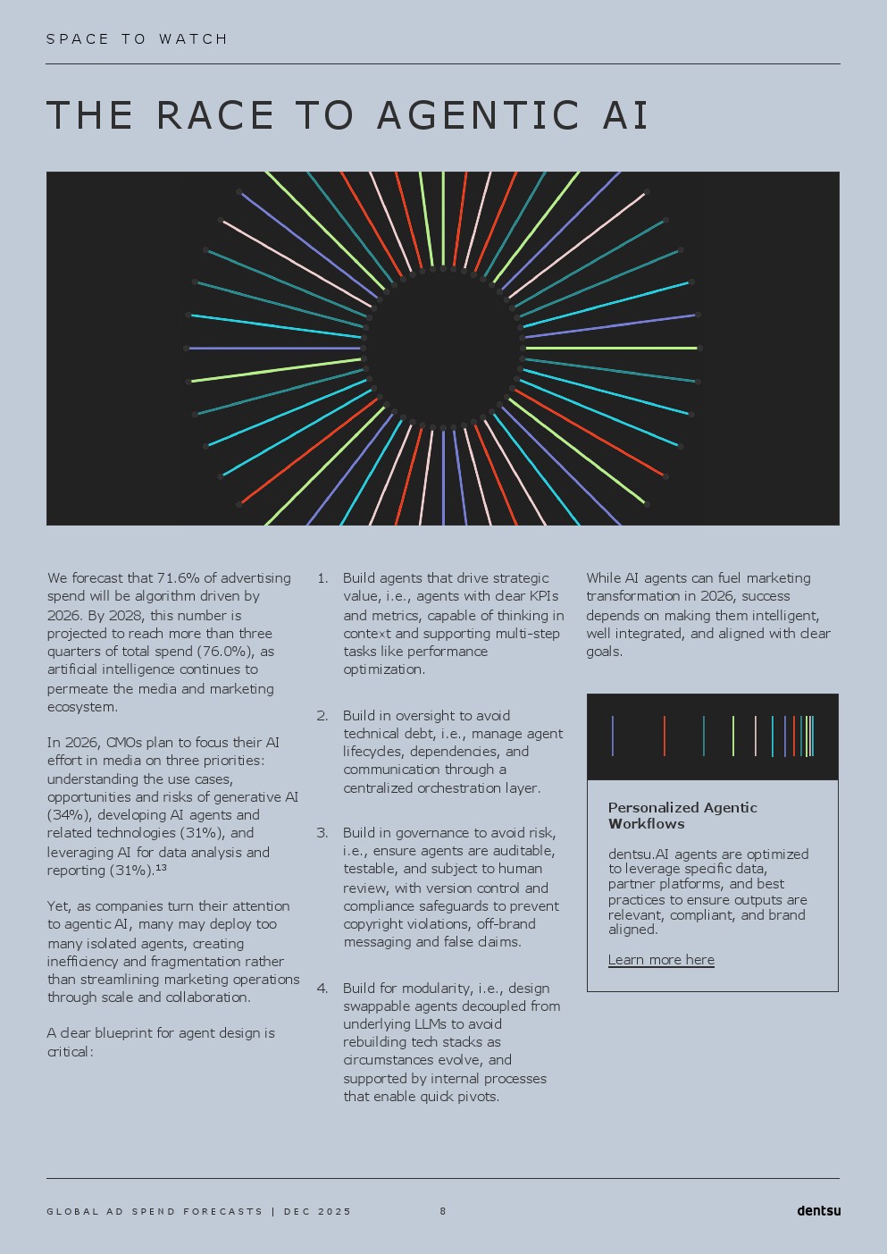算法驱动广告成为主导形态。2026年,71.6%的广告支出将由算法驱动,至2028年提升至76%。程序化交易占数字广告比重已达81.4%。广告投放逻辑正从人工经验转向数据、模型与自动化决策,媒体能力成为企业增长基础设施的一部分。