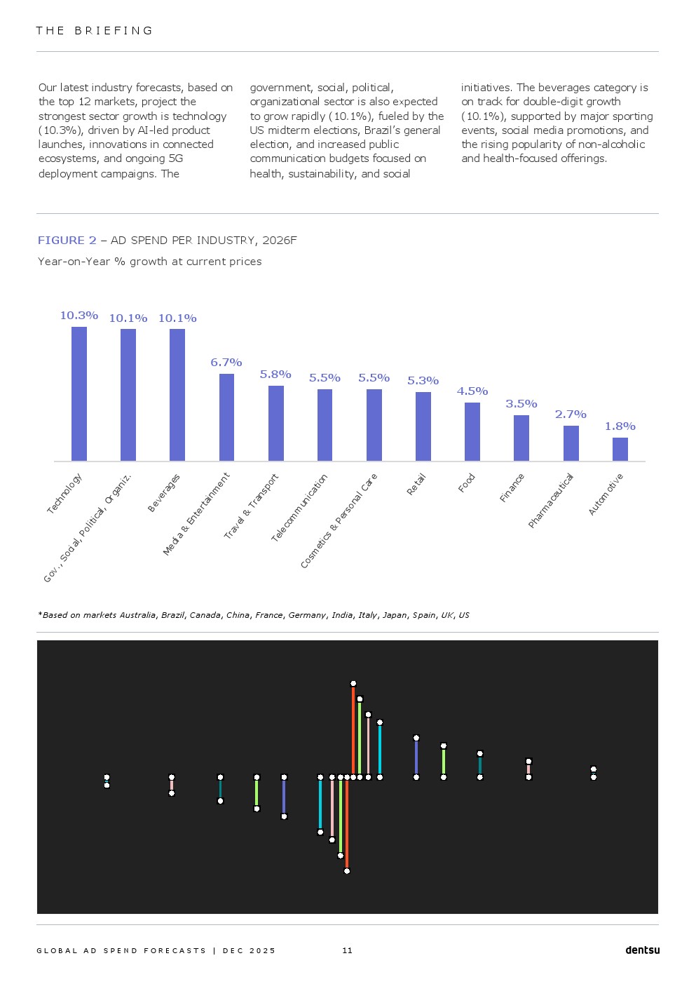 行业结构上,科技行业广告支出增速最高,达10.3%,主要受AI产品发布与生态扩张推动。政府及社会组织、饮料行业增速均超过10%。相对而言,汽车、医药等传统大类增速低于3%,行业间分化明显,反映不同赛道对增长预期的差异。