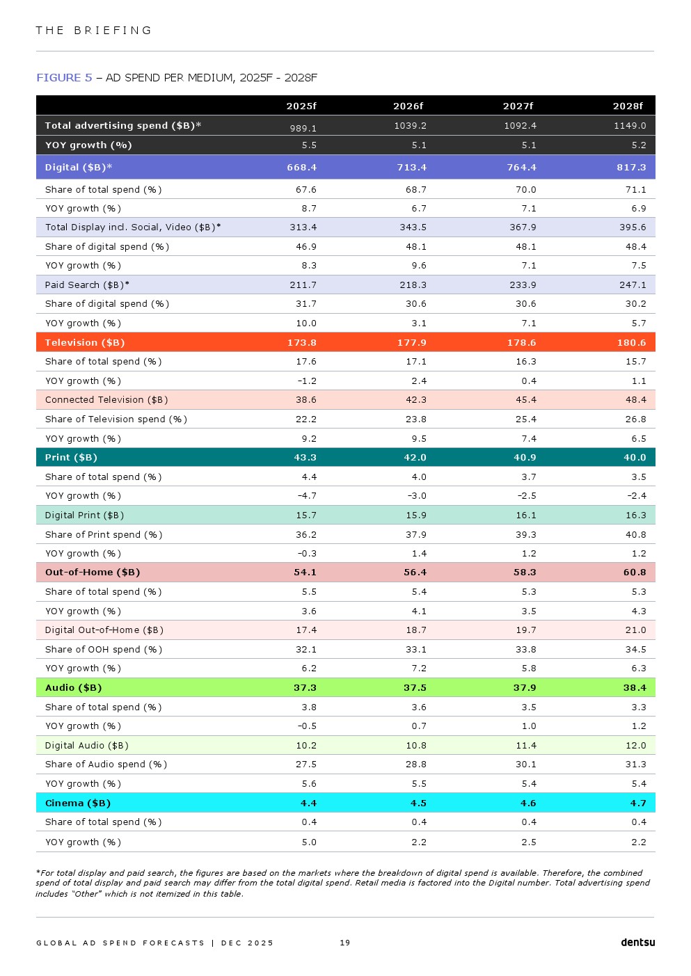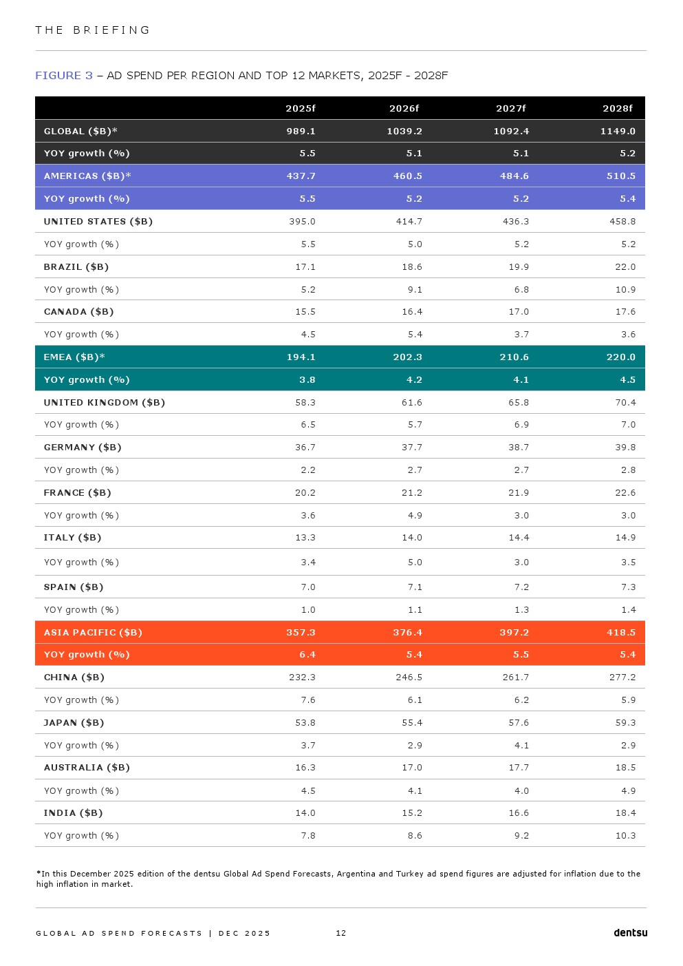 从区域结构看,亚太地区以5.4%的增速继续领跑全球,广告规模达3764亿美元,占全球比重36.2%。美洲市场增速为5.2%,规模4605亿美元,仍是全球最大单一区域。EMEA地区在经济承压背景下实现4.2%的增长,显示广告需求的区域分化与新兴市场韧性。