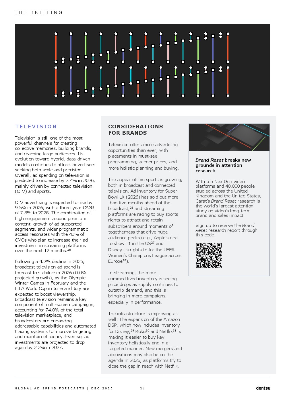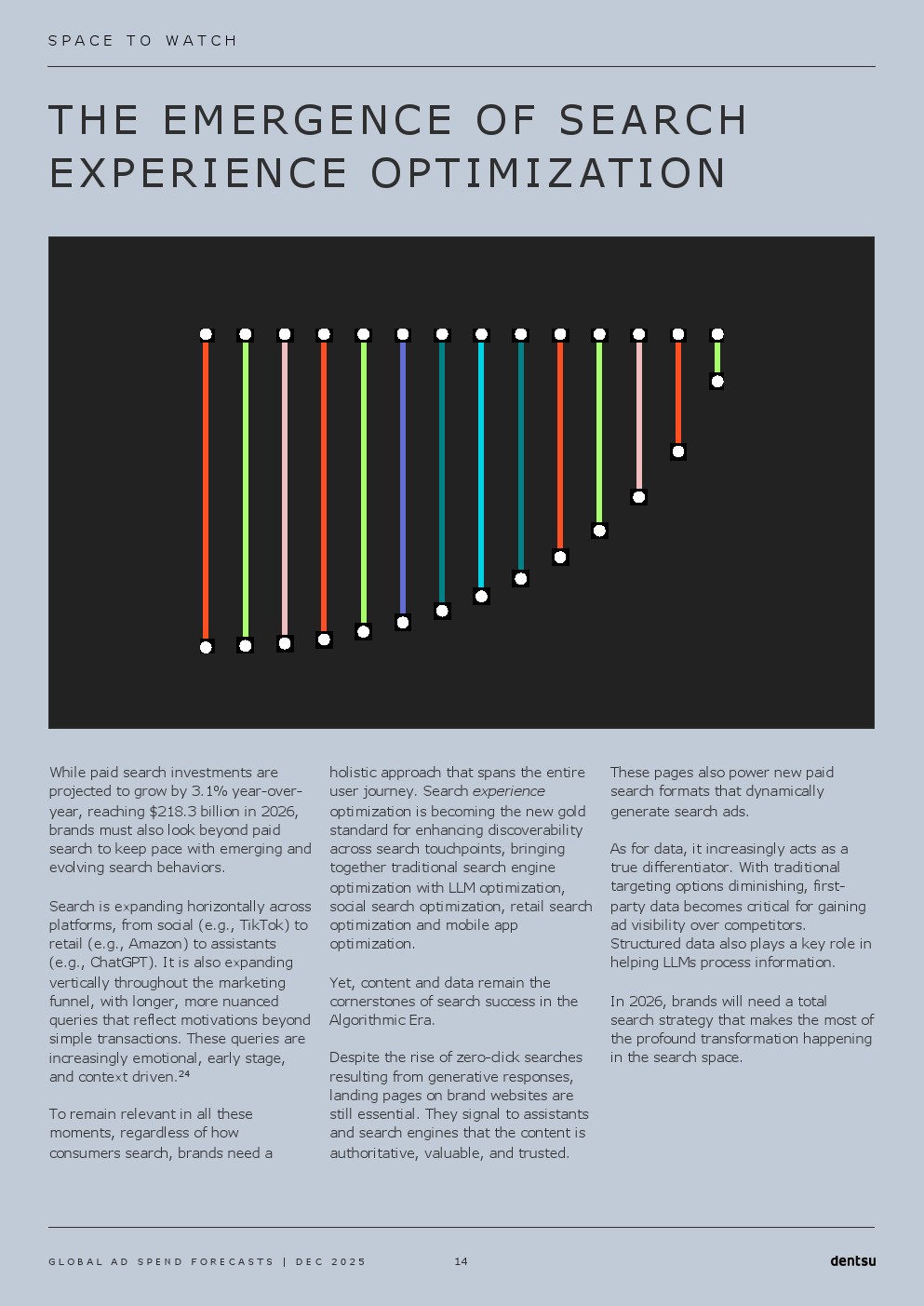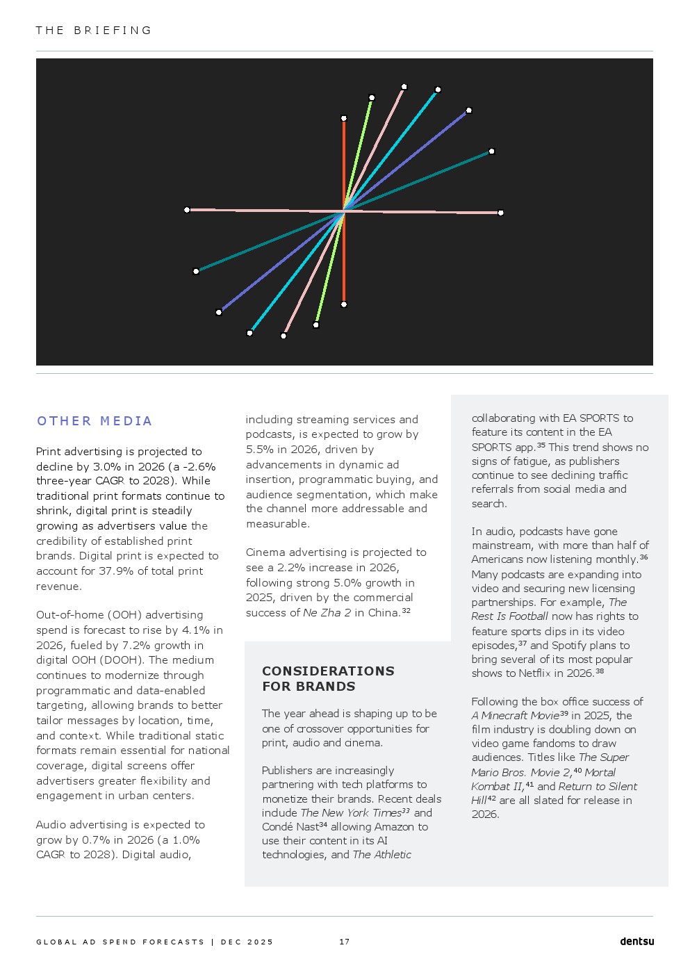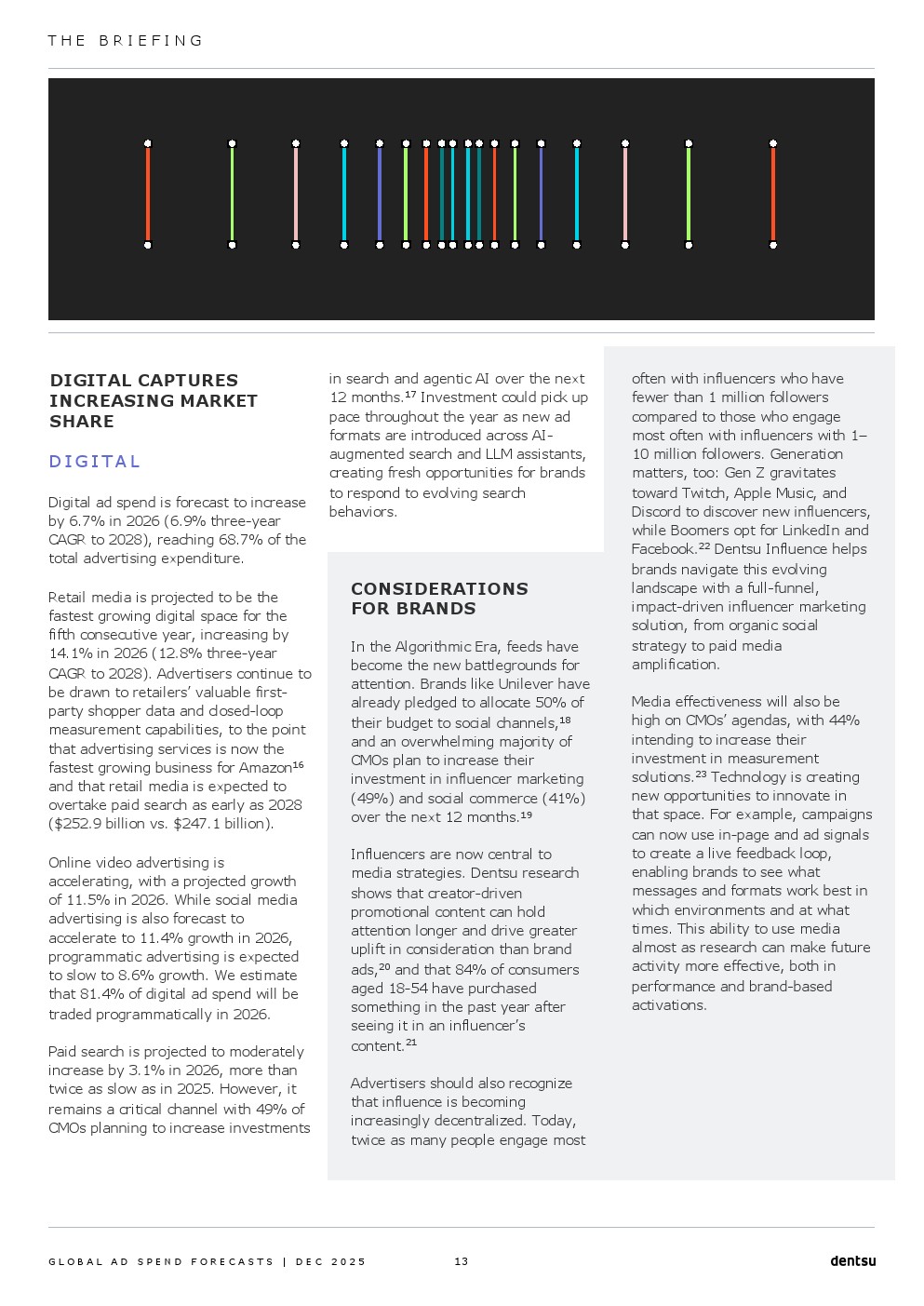 媒介结构持续向数字端集中。2026年数字广告支出预计增长6.7%,占全球广告比重升至68.7%。其中零售媒体同比增长14.1%,预计在2028年前后超过付费搜索,成为最大数字广告形态。在线视频与社交广告增速均超过11%,反映品牌预算向内容与场景迁移。