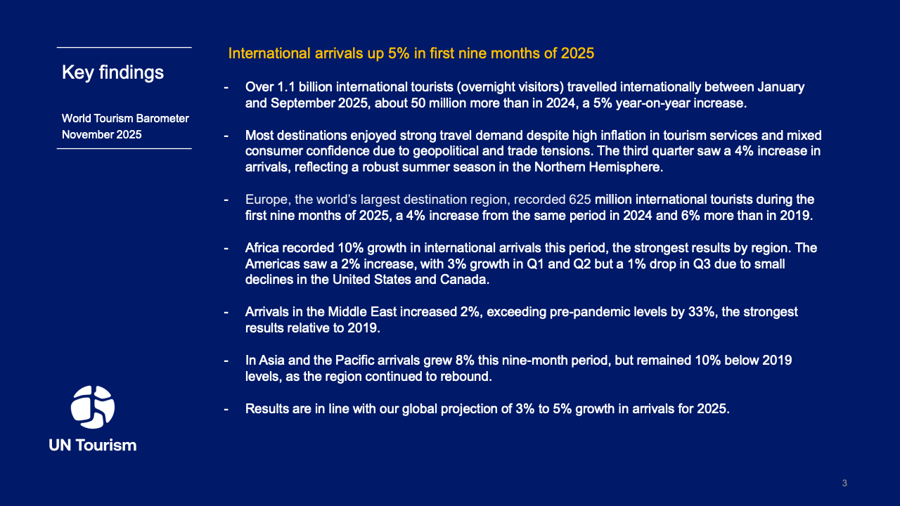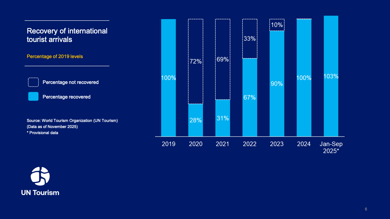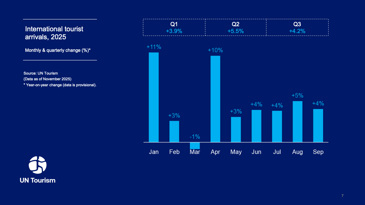 2025年全球旅游市场展现出强劲的复苏韧性,国际游客到访量达到15.2亿人次,同比增长4%,较2024年增加近6000万人次。这一数据标志着全球旅游业已基本回归疫情前的增长轨道,增速接近2009年至2019年间5%的年均水平。航空联通性的改善与签证便利化政策的推行,成为支撑年度增长的核心驱动力。