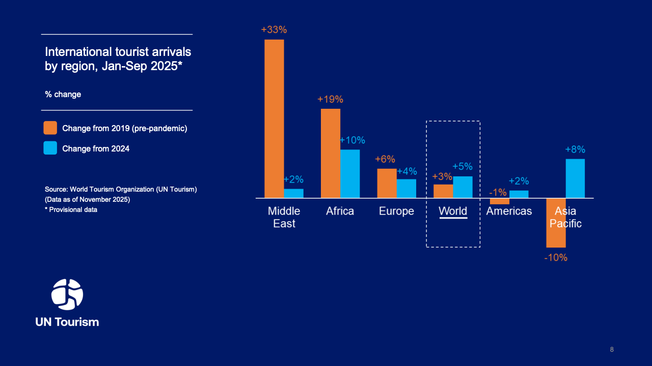 区域表现呈现非均衡增长态势,欧洲作为全球最大目的地,接待游客7.93亿人次,较2024年增长4%,比2019年水平高出6%。中东地区表现最为亮眼,到访量较2019年激增39%,全年游客量接近1亿人次。亚太地区持续复苏,到访量达3.31亿人次,同比增长6%,尽管仍较2019年低9%,但东北亚以13%的增速领跑区域增长。