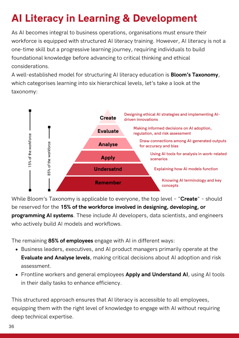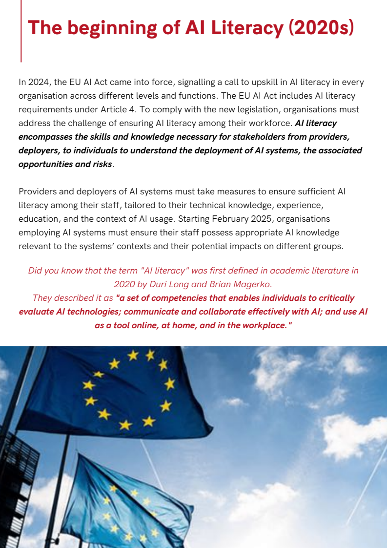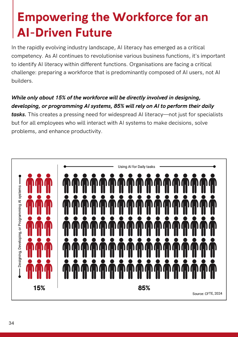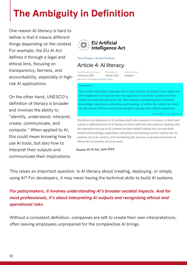 在制度层面,欧盟AI法案已将AI素养写入合规要求,自2025年起,使用AI系统的组织必须确保员工理解相关风险、应用场景与潜在影响。监管逻辑不再局限技术部门,而是覆盖管理层与一线员工,推动AI素养从“能力加分项”转变为“合规底线”。