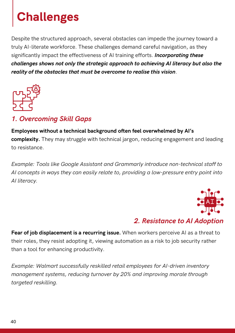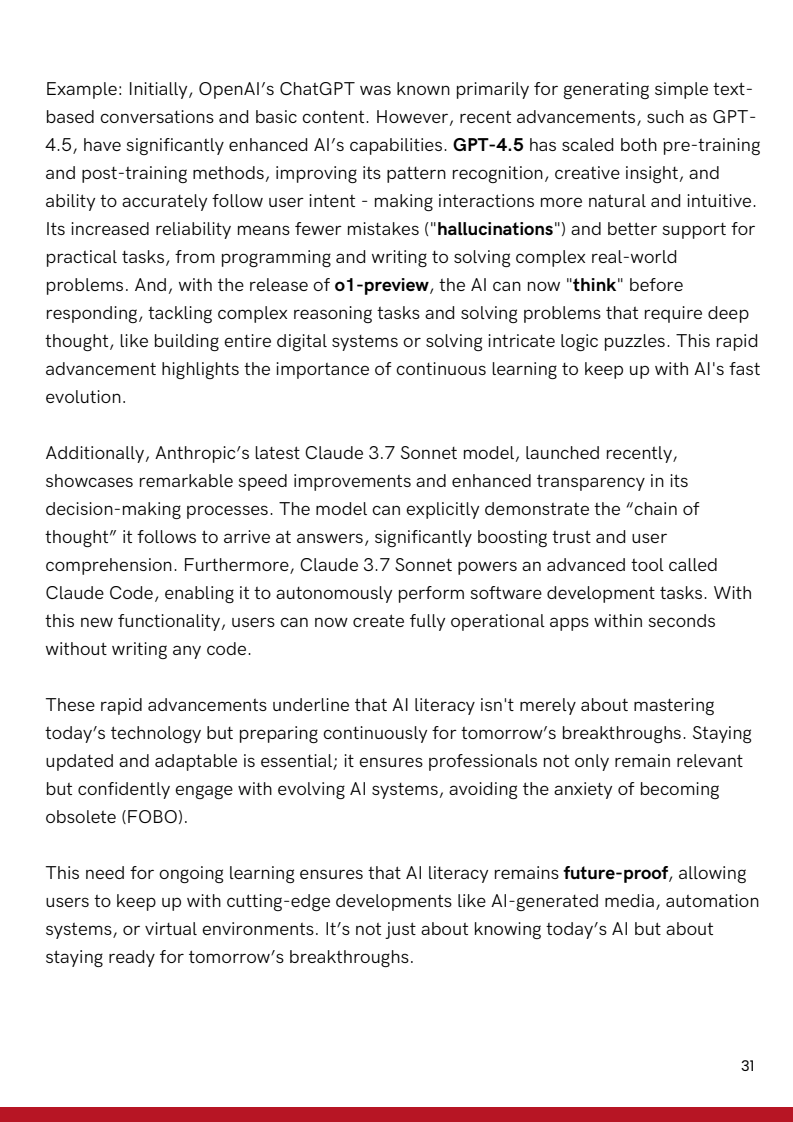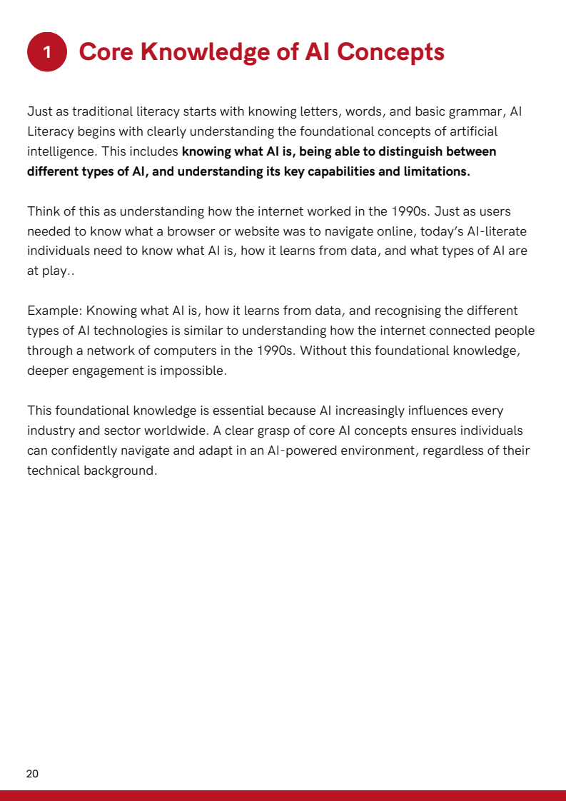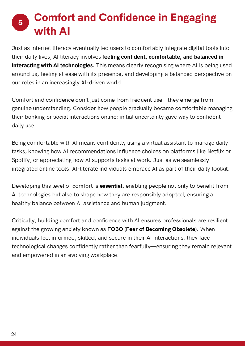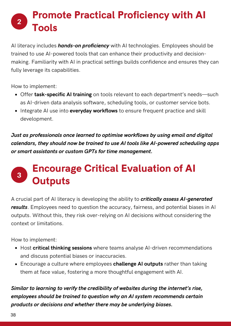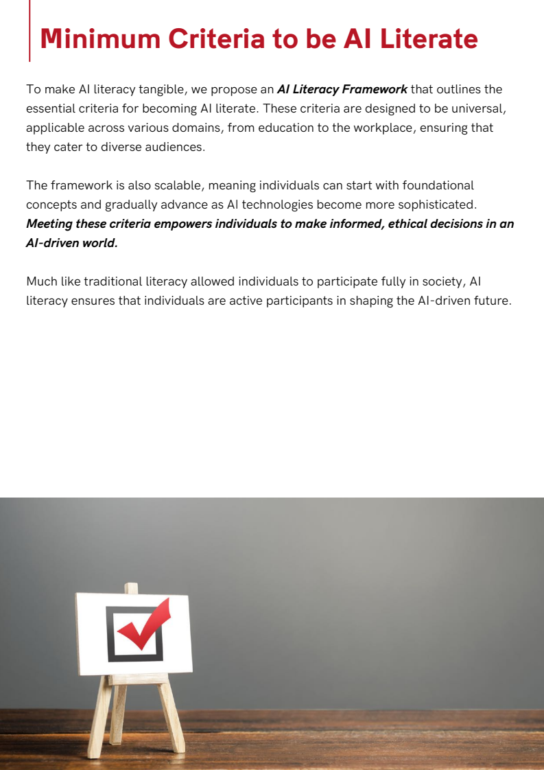 白皮书进一步将AI素养拆解为五个可操作维度,包括基础概念理解、工具交互能力、输出的批判性评估、风险与伦理意识,以及与AI共事的信心。这一结构回应了现实中的主要失误来源:企业往往完成工具部署,却忽视员工对偏见、幻觉与决策责任的理解,导致合规和声誉风险。