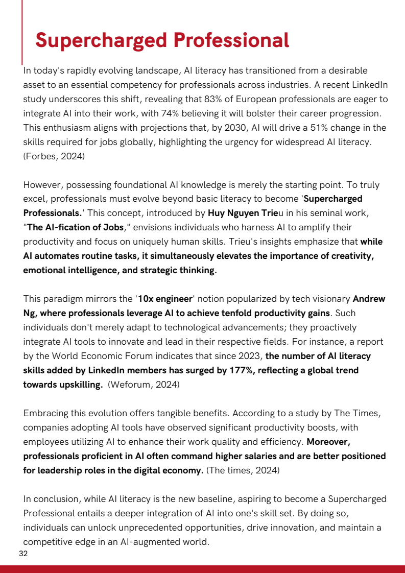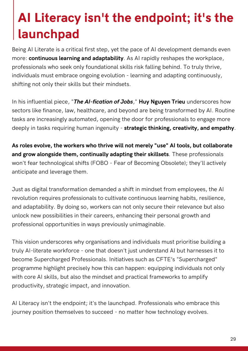 趋势上看,AI素养正在经历类似早期互联网素养的路径,但节奏显著更快。技能半衰期缩短,持续学习成为核心变量。报告认为,未来竞争优势将集中于“超级赋能型”专业人士,即能利用AI放大生产率、同时保留人类判断与创造力的人群。由此,AI素养不只是适应变化的防御性能力,而是决定个人与组织能否在下一轮生产率跃迁中占据主动的关键变量。