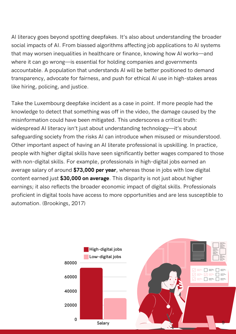 就业与收入数据进一步放大了AI素养的经济含义。报告引用研究显示,高数字化岗位年均收入约7.3万美元,而低数字化岗位仅约3万美元,收入差距超过一倍。同时,85%的员工将作为AI使用者而非AI开发者参与工作流程,仅15%直接从事模型设计与开发。这意味着,AI素养的核心不在“写代码”,而在于理解、评估和正确使用AI输出。