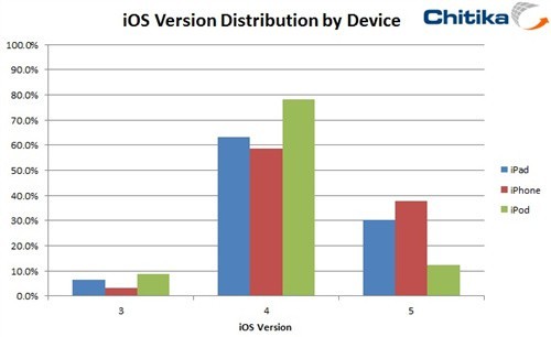 网络广告商Chitika研究部门Chitika Insights的数据说明,37.7%的iPhone用户和30.3%的iPad用户使用iOS 5,远远超出20%的平均水平。