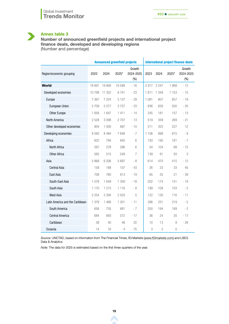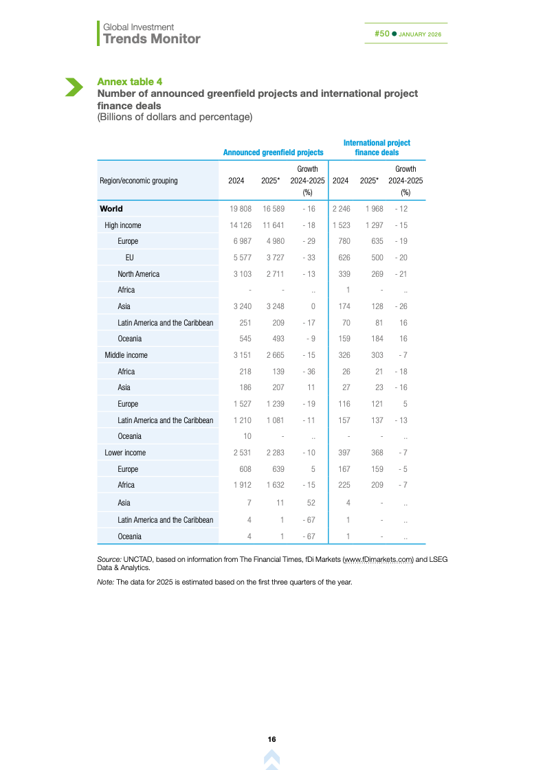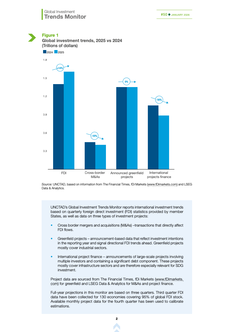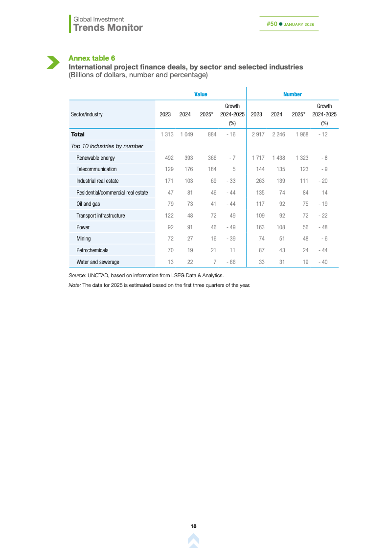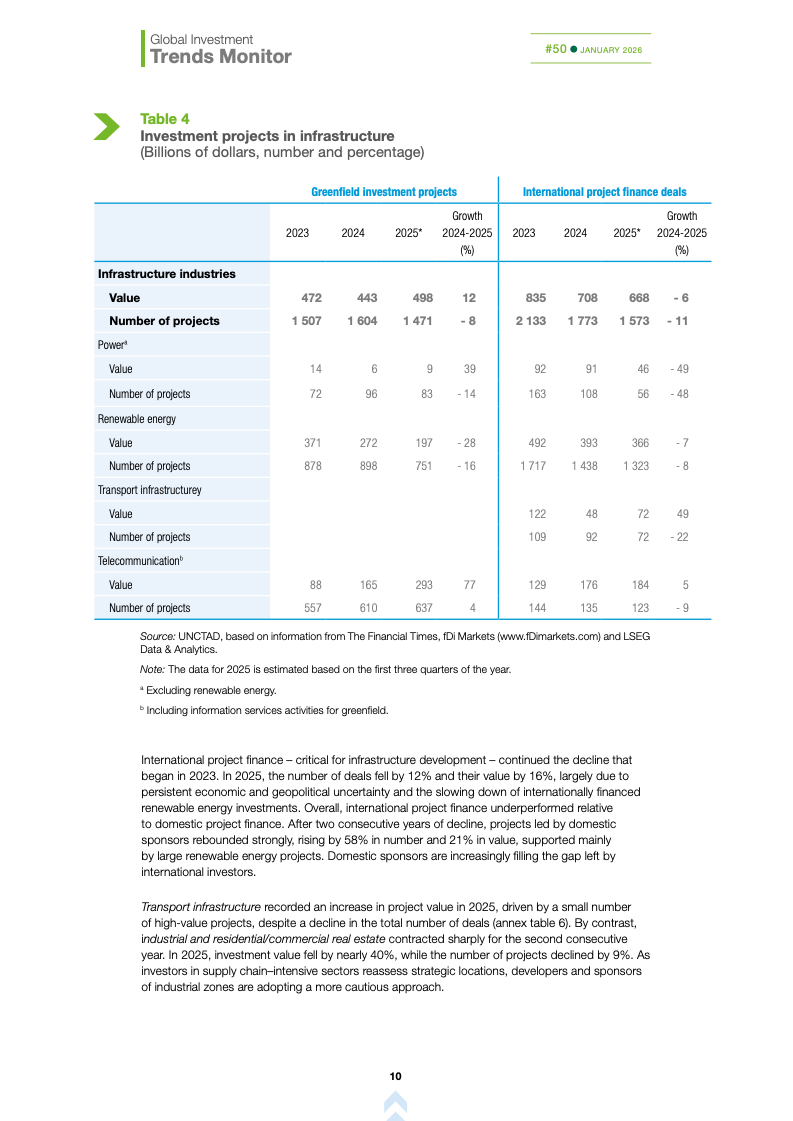 基础设施与能源转型投资持续承压。国际基础设施投资额下降10%,主要受可再生能源项目大幅萎缩影响,投资者正重新评估收益风险与监管环境。这加剧了高度依赖国际融资国家的发展缺口,可能制约全球能源转型进程,使新兴市场在长期基础建设竞争中处于不利地位。